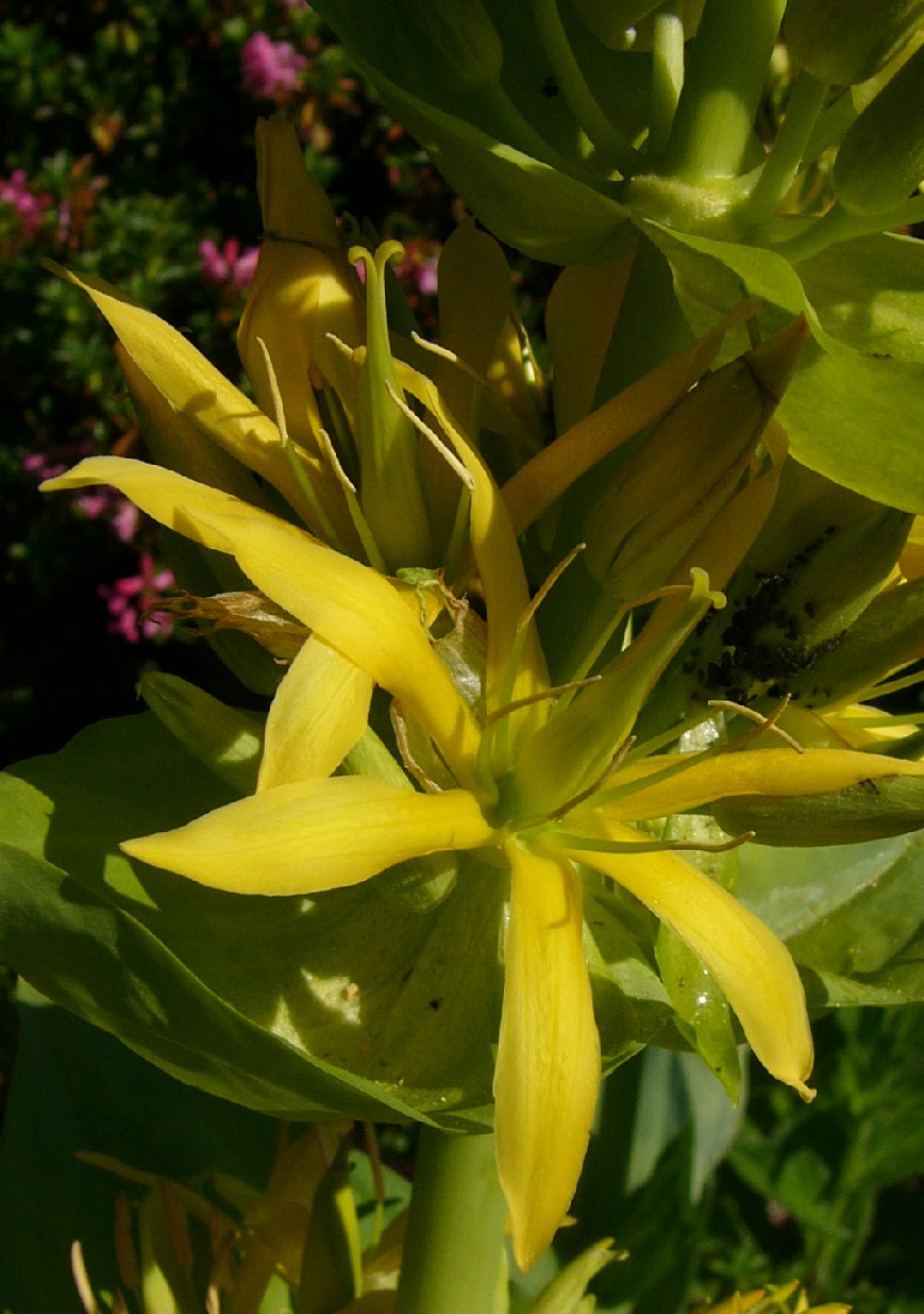 Blüten scheinbar quirlständig Staubblätter kahl 1 Griffel, 2 spreizende Narben > Enzian (Gentiana)