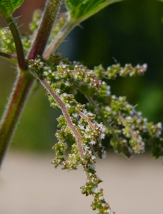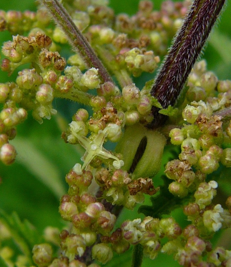 mit Brennhaaren Blüten ein- oder zweihäusig getrenntgeschlechtlich, blattachselständig Männchen mit 4 Staubblättern, Weibchen mit büscheliger Narbe > Brennnessel (Urtica)