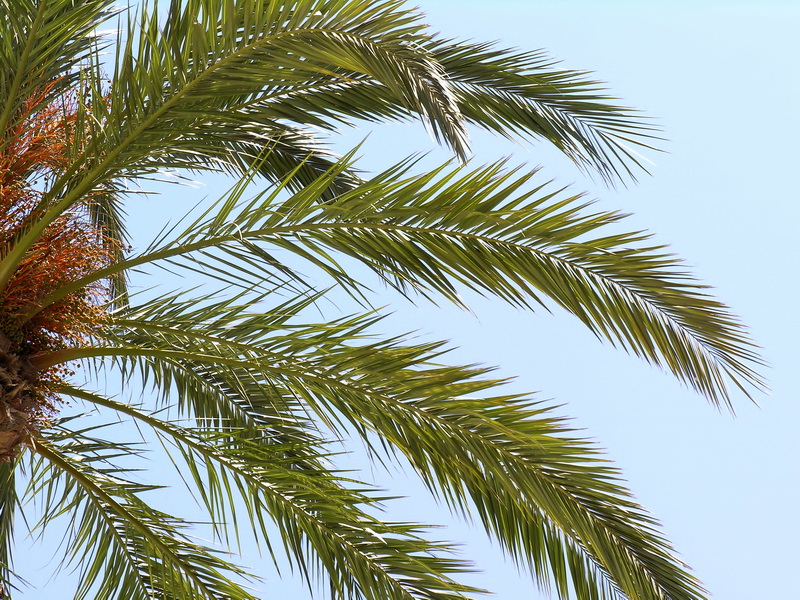 Blätter entweder fiederteilig (Fiederpalmen) oder fächerförmig (Fächerpalmen)