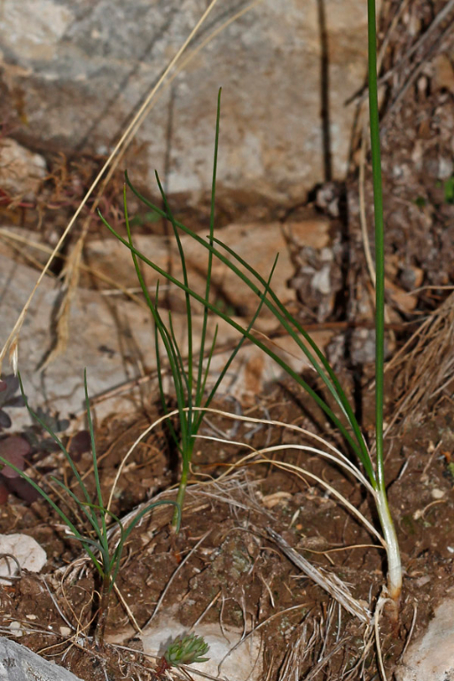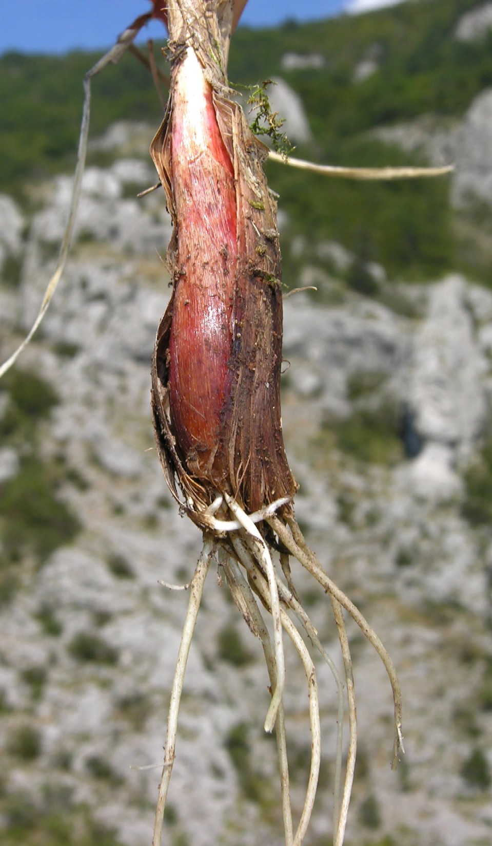 Zwiebel zylindrisch, einzeln oder zu 2 auf einem 5 - 10 mm dicken kurzen Rhizom aufsitzend, Äußere Zwiebelhülle braun, netzfaserig