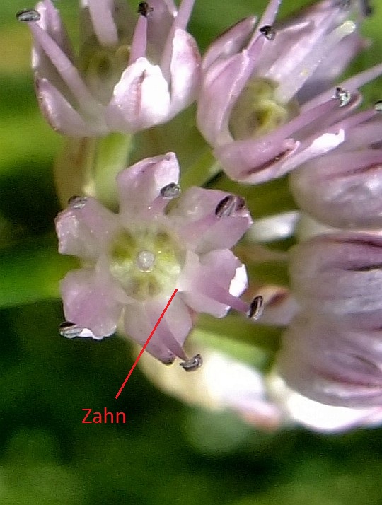 Fruchtknoten oft weiß/grün, Perigonblätter 4 mm lang, 2 mm breit, gelblichweiß oder weiß, oft auch rosa überlaufen, mit einem oft undeutlichen grünen oder rötlichen Mittelstreifen