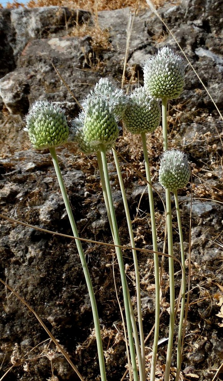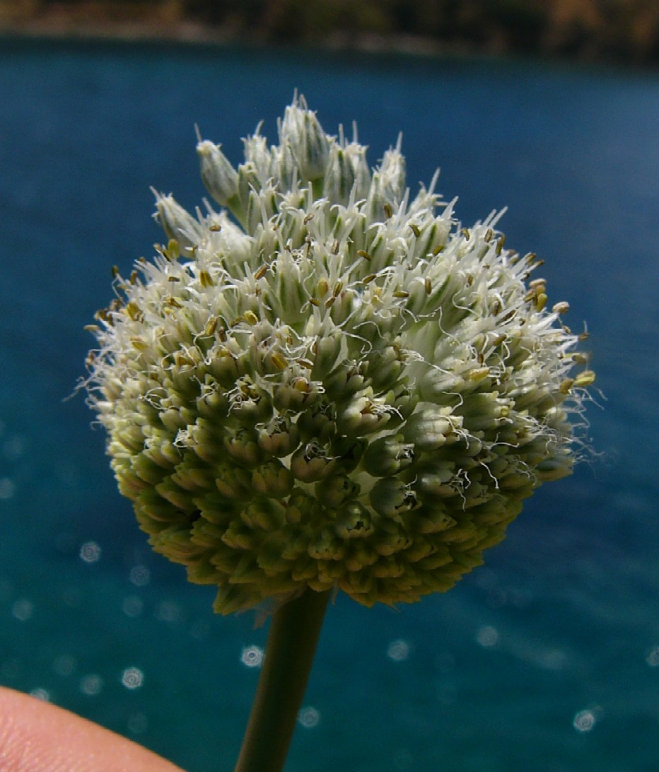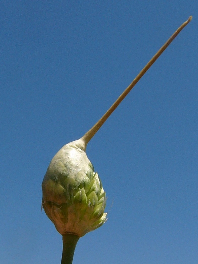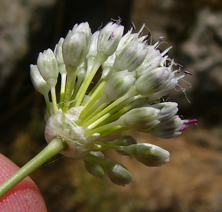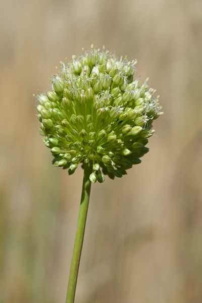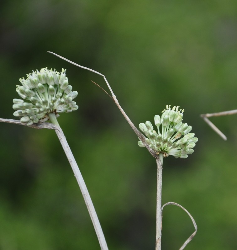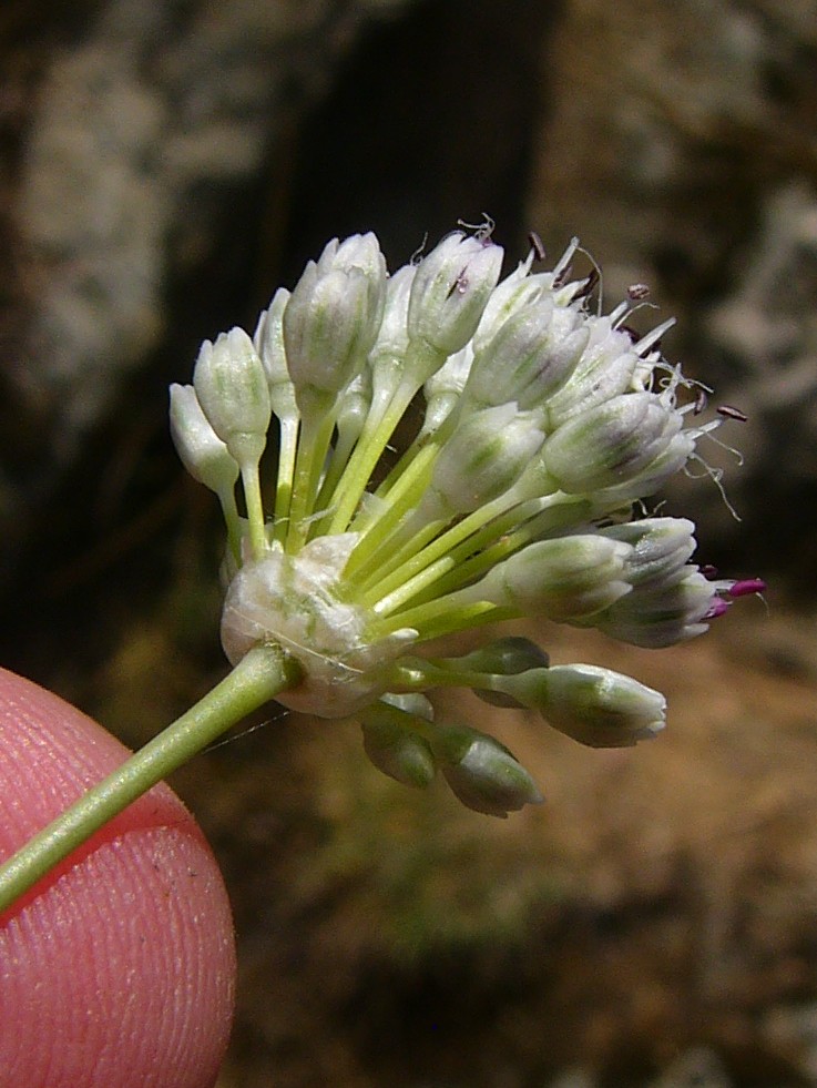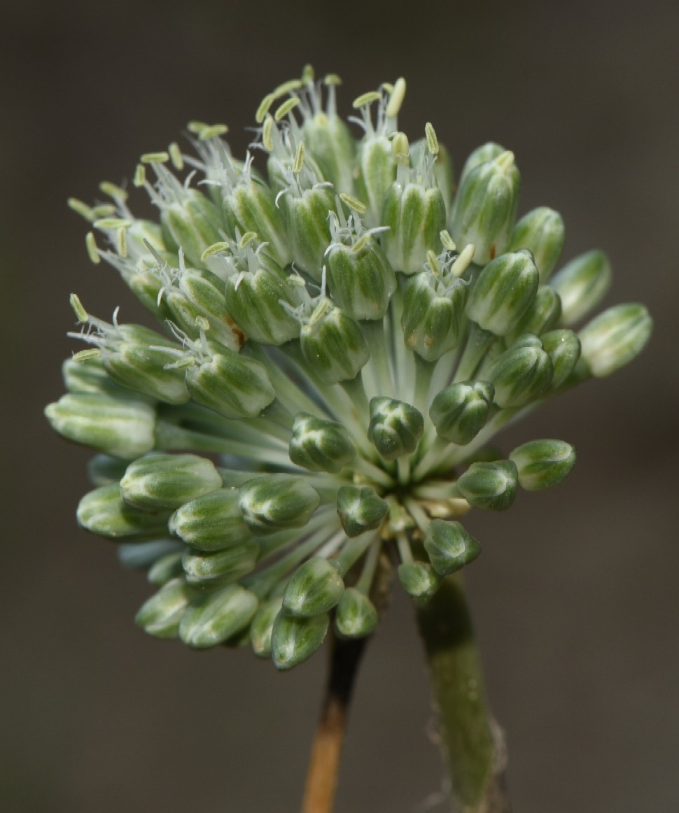 Allium - Blütenstand ohne Bulbillen, Blüten weiß oder grünlich, in kugeligen vielblütigen Köpfchen, Blütenstiele schlank, nicht aufgeblasen, Blätter 1 - 5 mm breit, Staubblätter länger als die Perigonblätter, innere Staubblätter mit je 2 pfriemlichen Fortsätzen, die aus der Blüte ragen