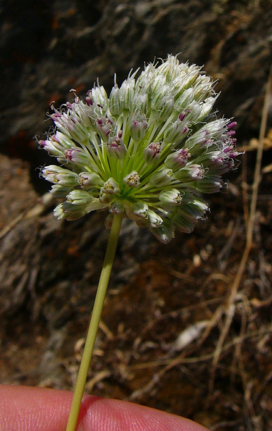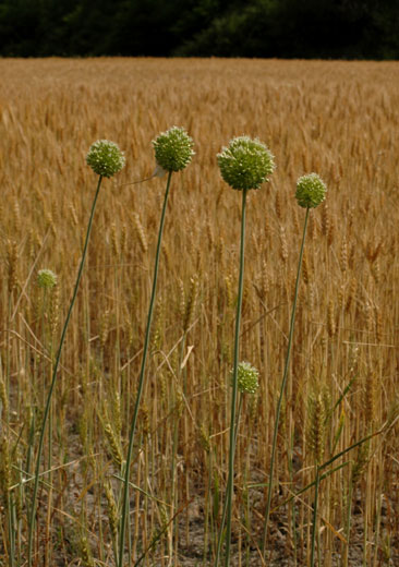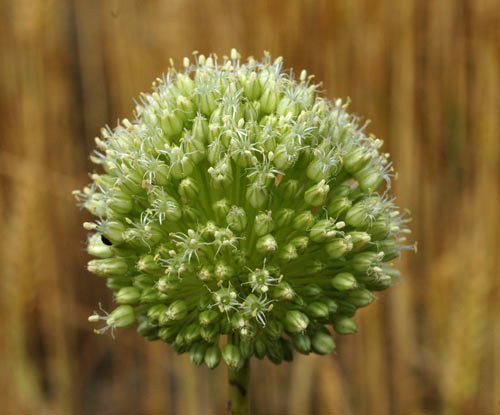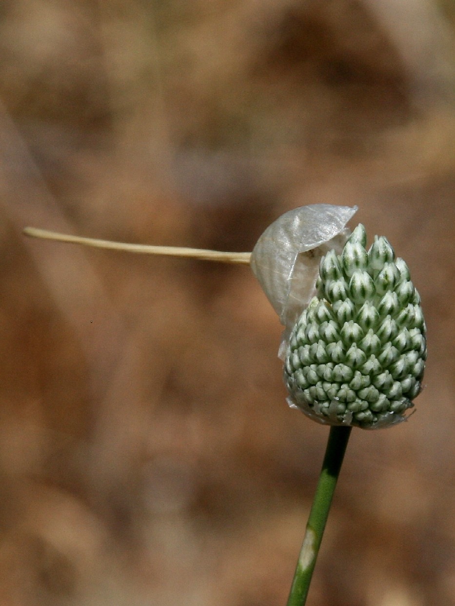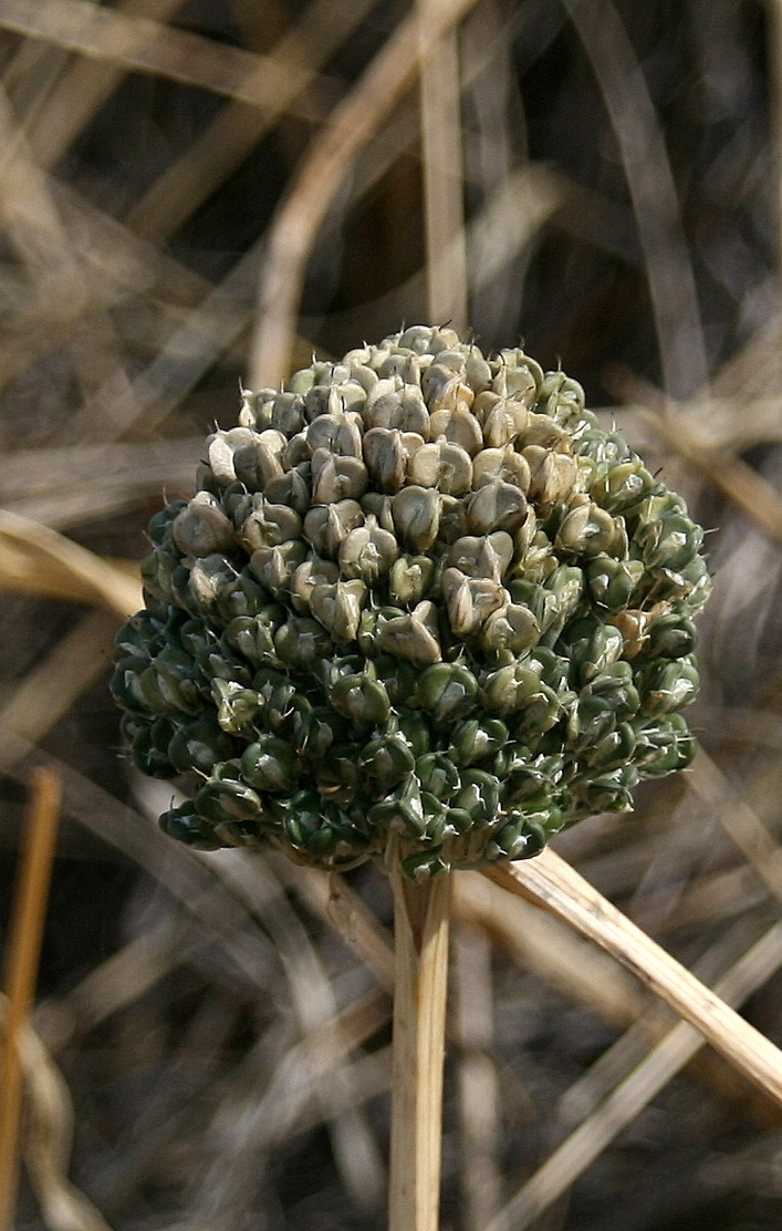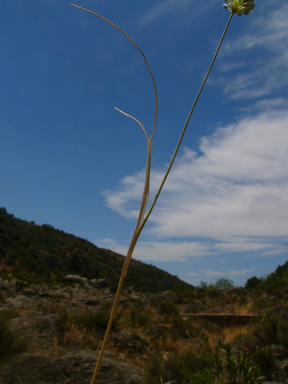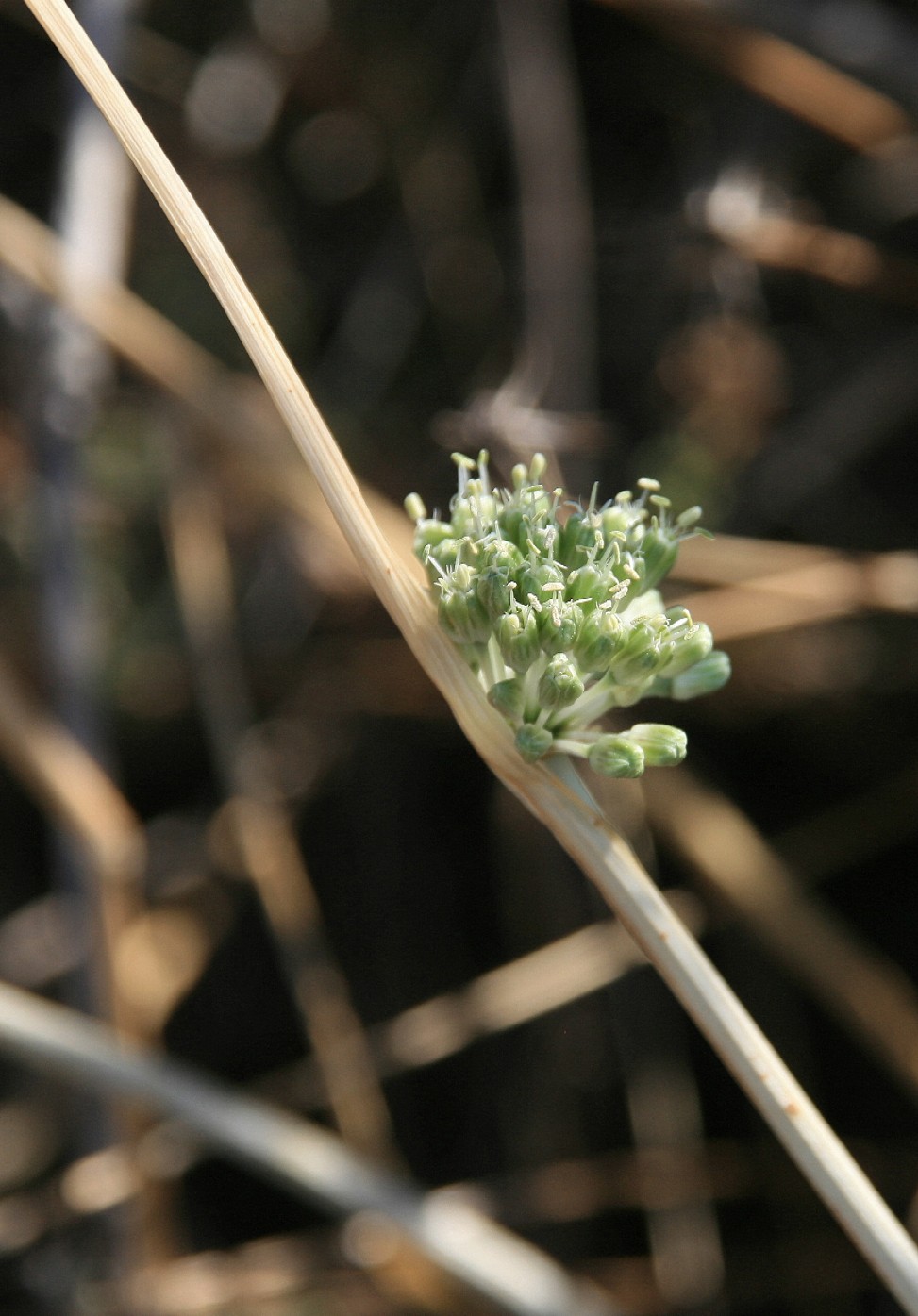 Allium - Blütenstand ohne Bulbillen, Blüten weiß oder grünlich, in kugeligen vielblütigen Köpfchen, Blütenstiele schlank, nicht aufgeblasen, Blätter 1 - 5 mm breit, Staubblätter länger als die Perigonblätter, innere Staubblätter mit je 2 pfriemlichen Fortsätzen, die aus der Blüte ragen
