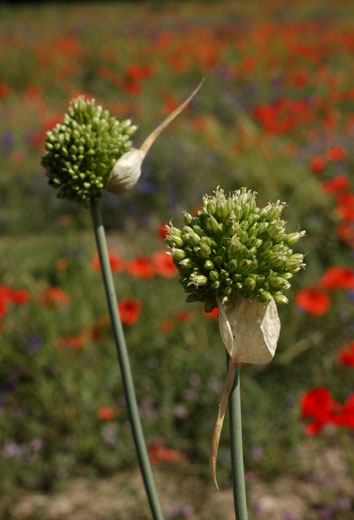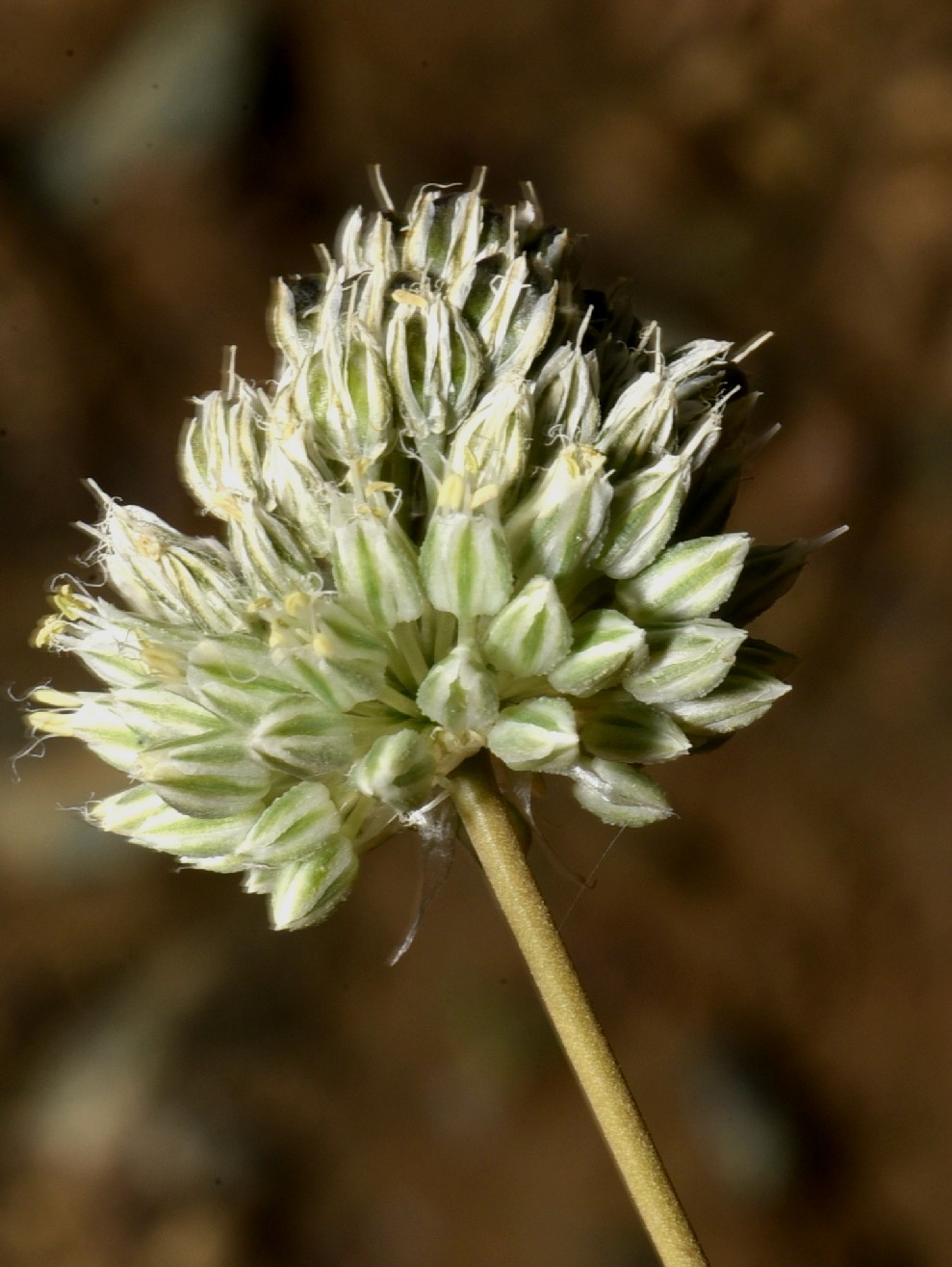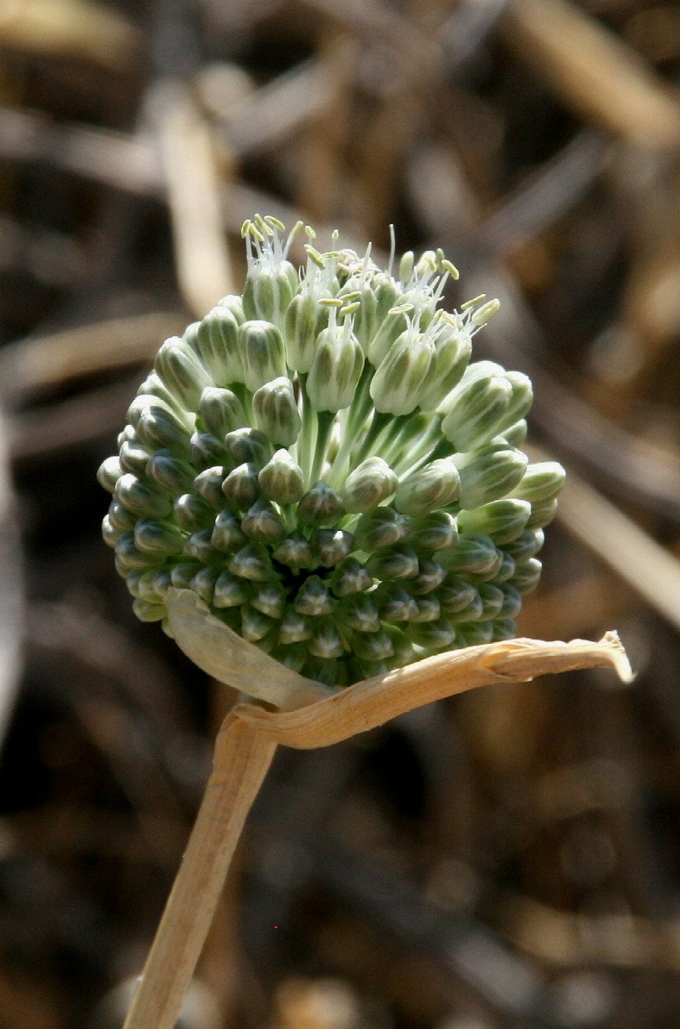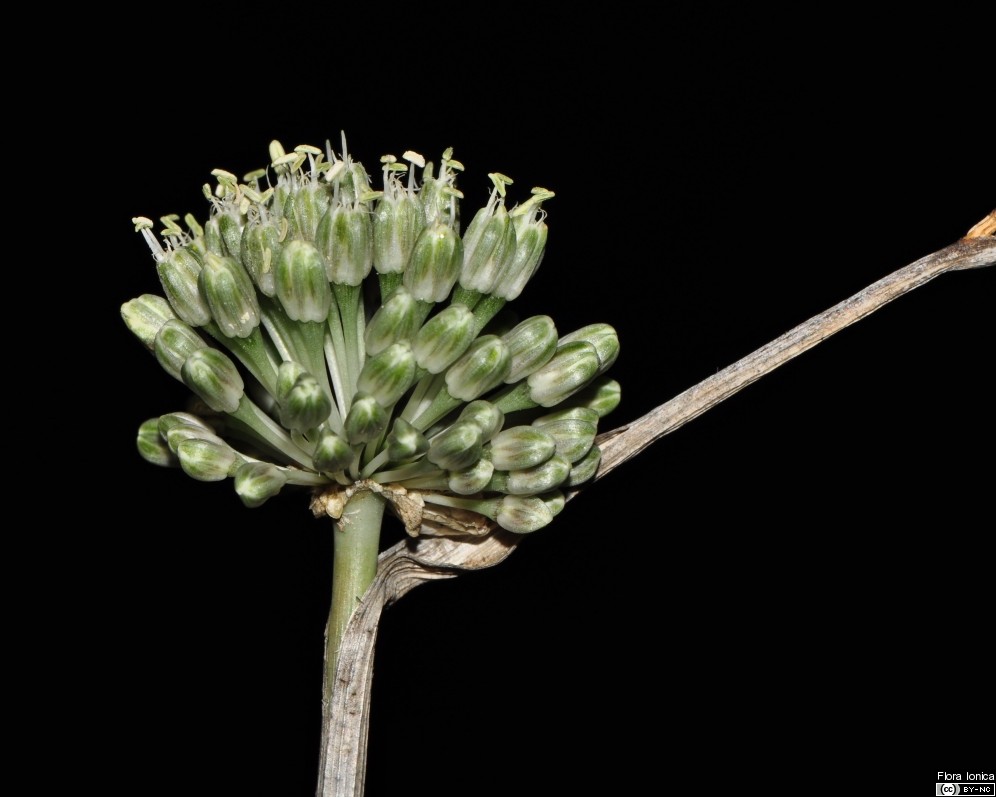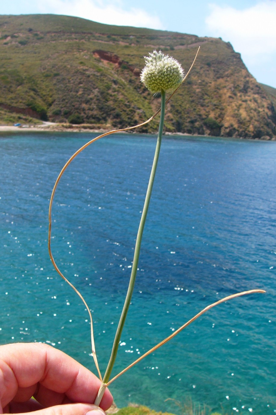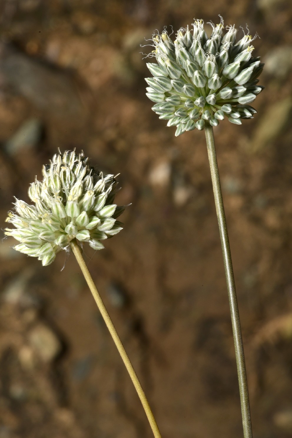 Allium - Blütenstand ohne Bulbillen, Blüten weiß oder grünlich, in kugeligen vielblütigen Köpfchen, Blütenstiele schlank, nicht aufgeblasen, Blätter 1 - 5 mm breit, Staubblätter länger als die Perigonblätter, innere Staubblätter mit je 2 pfriemlichen Fortsätzen, die aus der Blüte ragen