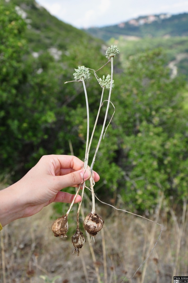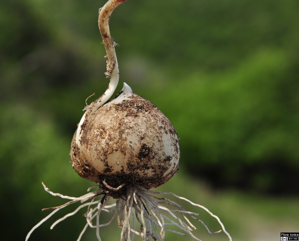 Zwiebel kugelig, ca. 2 cm im Durchmesser, äußere Tuniken papierartig, dünn, ohne Nebenzwiebeln