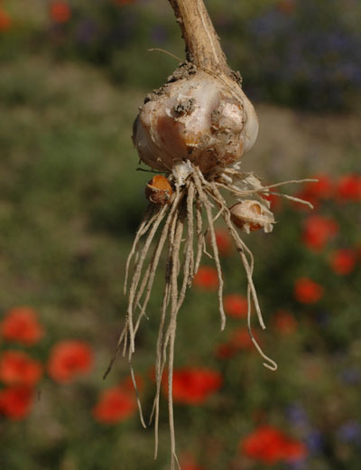 Zwiebel kugelig, 1 - 2 cm im Durchmesser, äußere Tunica membranös Fasern, innere Tunica membranös, weiß