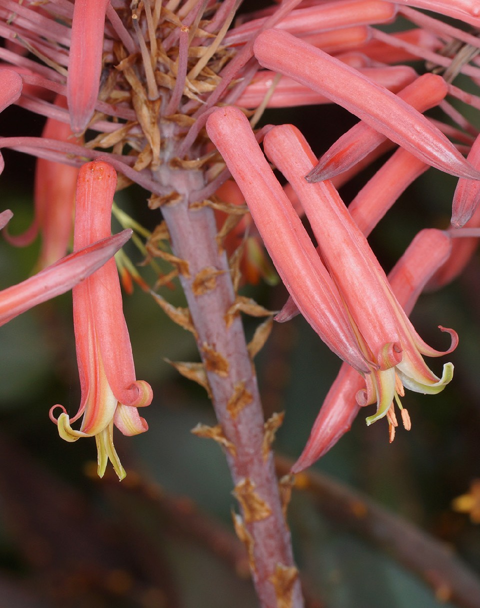 Blüten 25 - 40 mm lang stumpf scharlachrot oder orange, röhrig, Blüten 35 - 40 mm lang gestielt, Staubblätter und Griffel wenig länger als die Blüten, Brakteen 10 mm lang