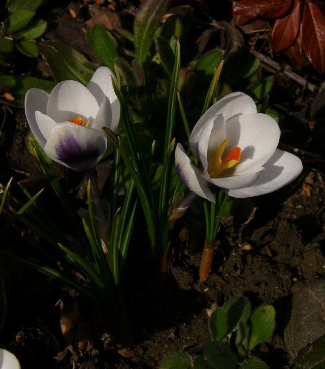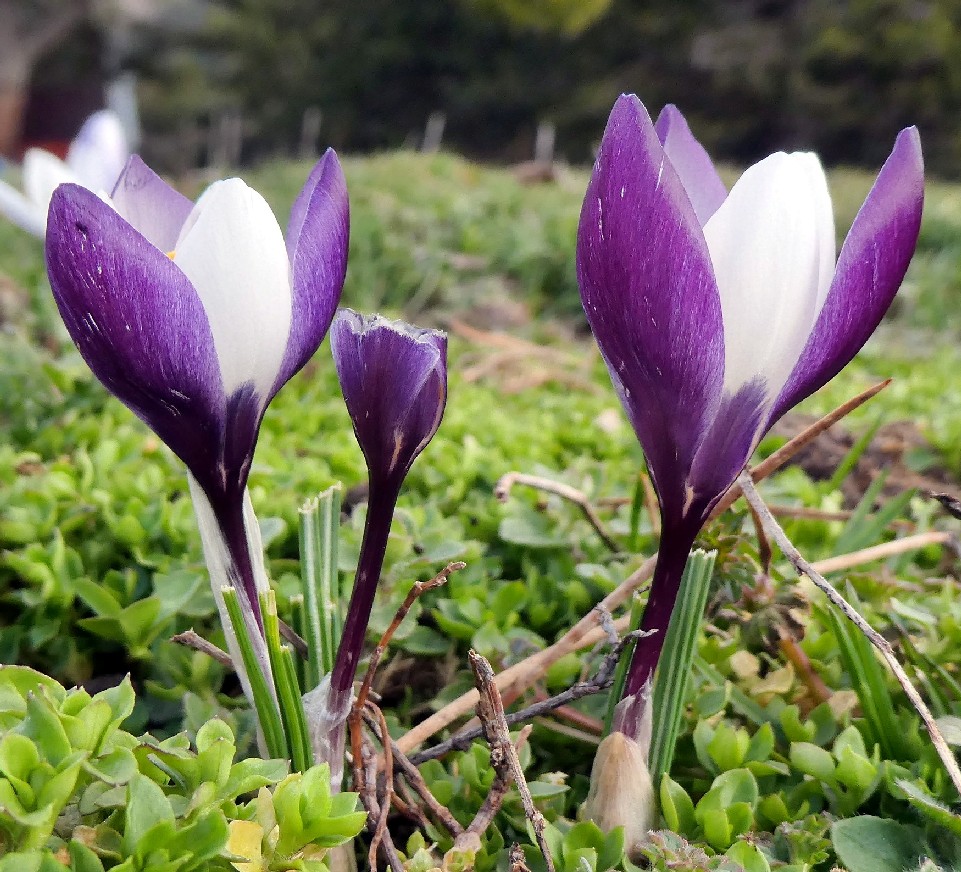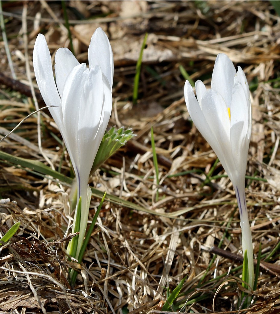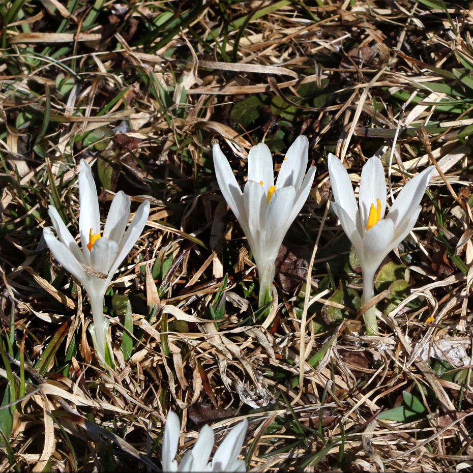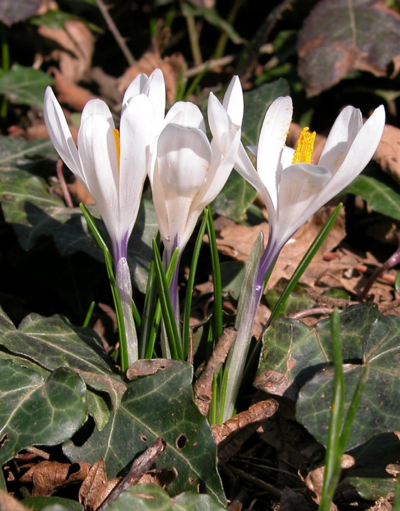 Crocus - Frühjahrsblüher, Blüten überwiegend weiß, Schlund weiß oder violett, Narbe mit 3 Ästen