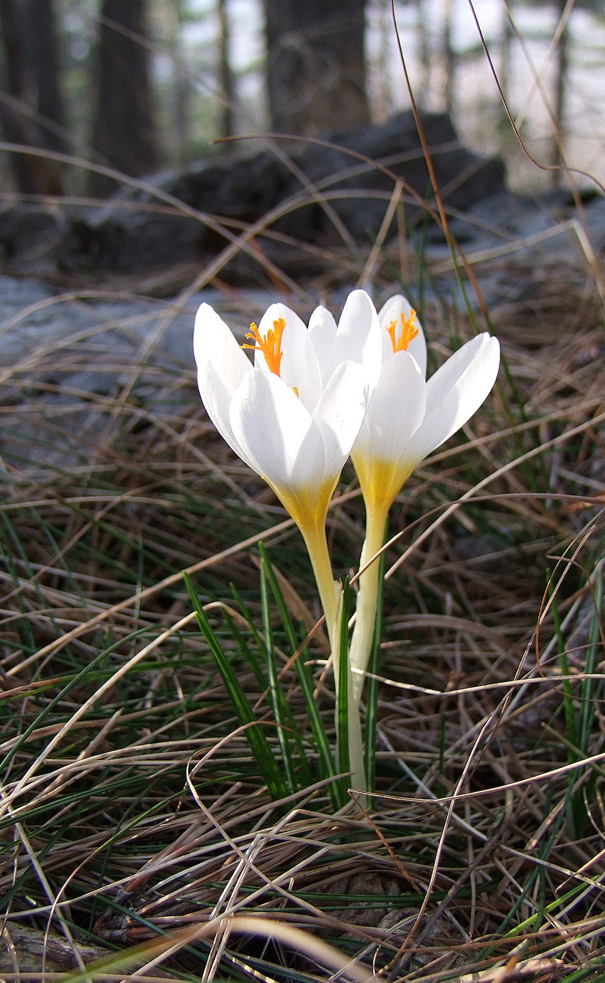 Crocus - Frühjahrsblüher, Blüten überwiegend weiß, Schlund gelb, Narbe mit 3 Ästen