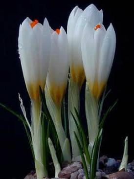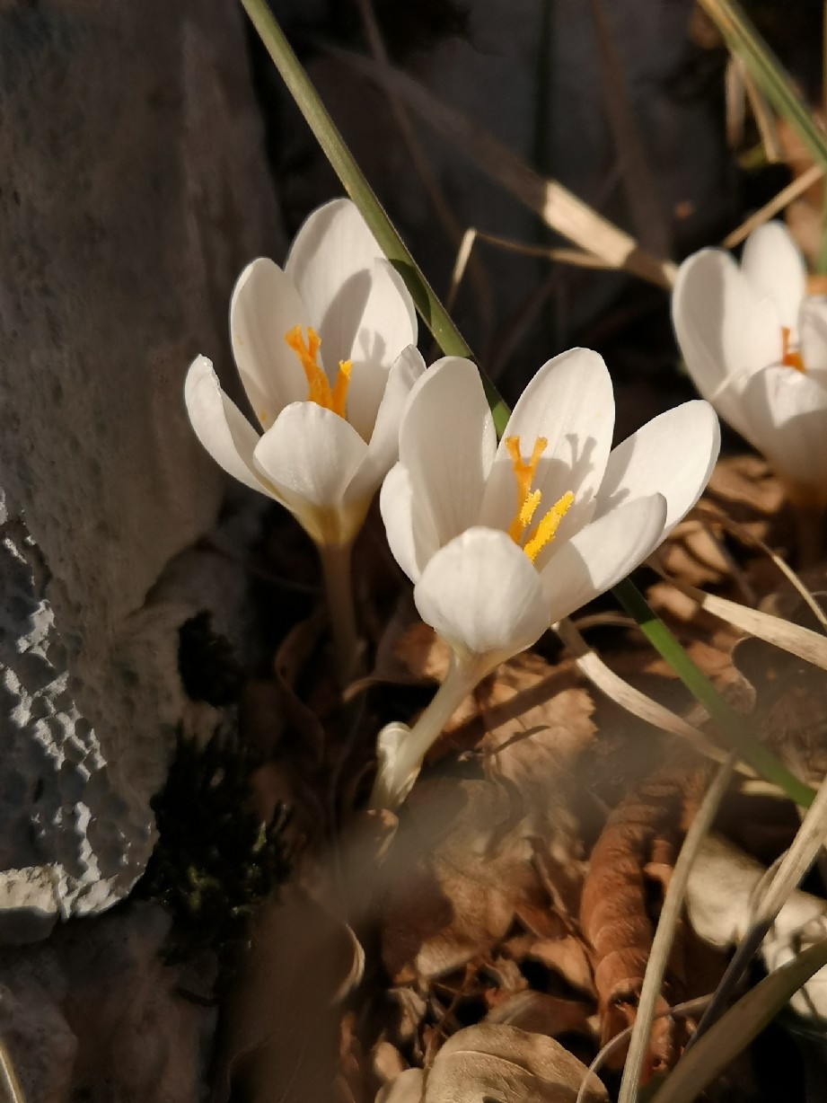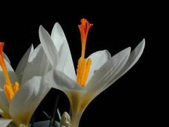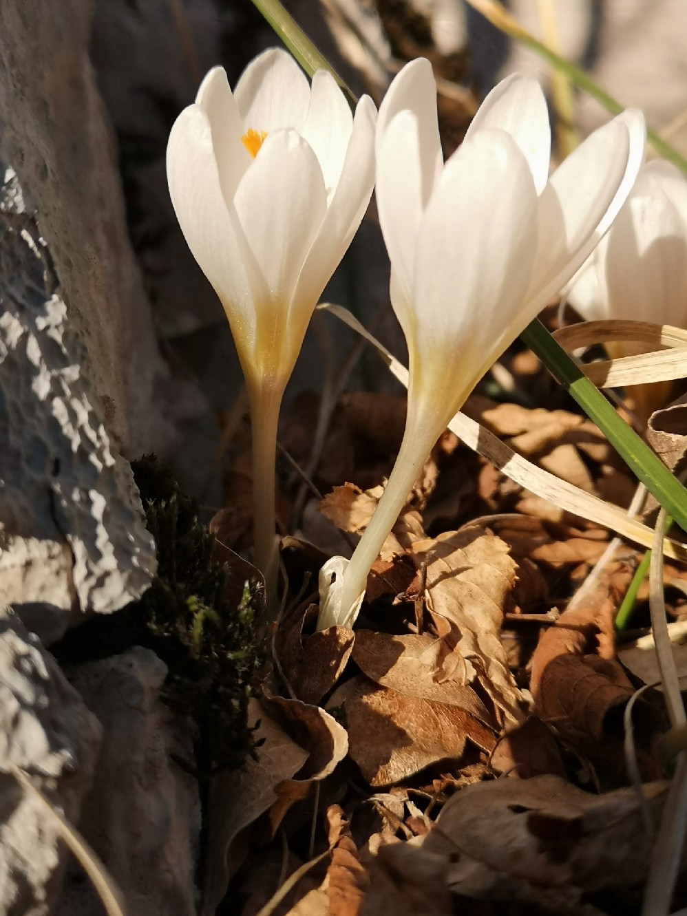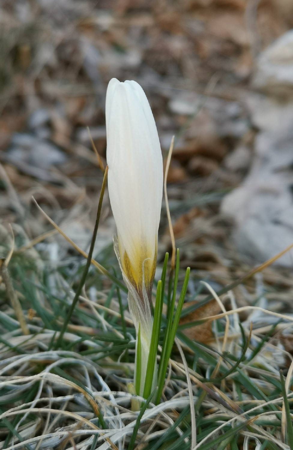 Crocus - Frühjahrsblüher, Blüten überwiegend weiß, Schlund gelb, Narbe mit 3 Ästen, Brakteole viel schmaler als die Braktee