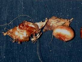 Zwiebelhülle spaltet sich in parallele Fasern auf, ohne Ringe an der Basis