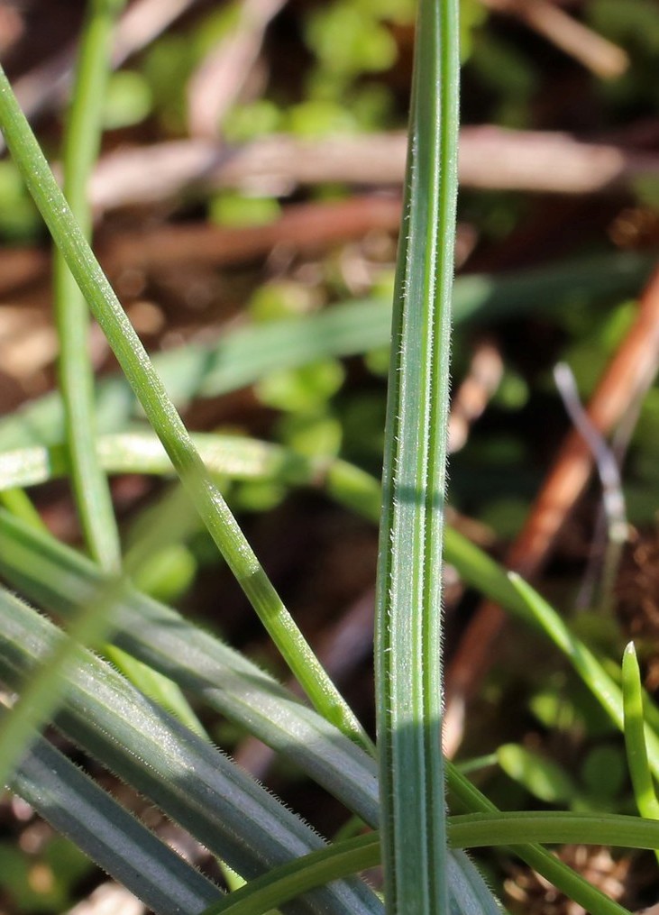 Blätter graugrün bis 1,5 mm breit, am Rand und auf dem Kiel behaart, oberseits mit weißem Mittelstreifen, laterale Kanäle sehr eng, Kiel sehr breit