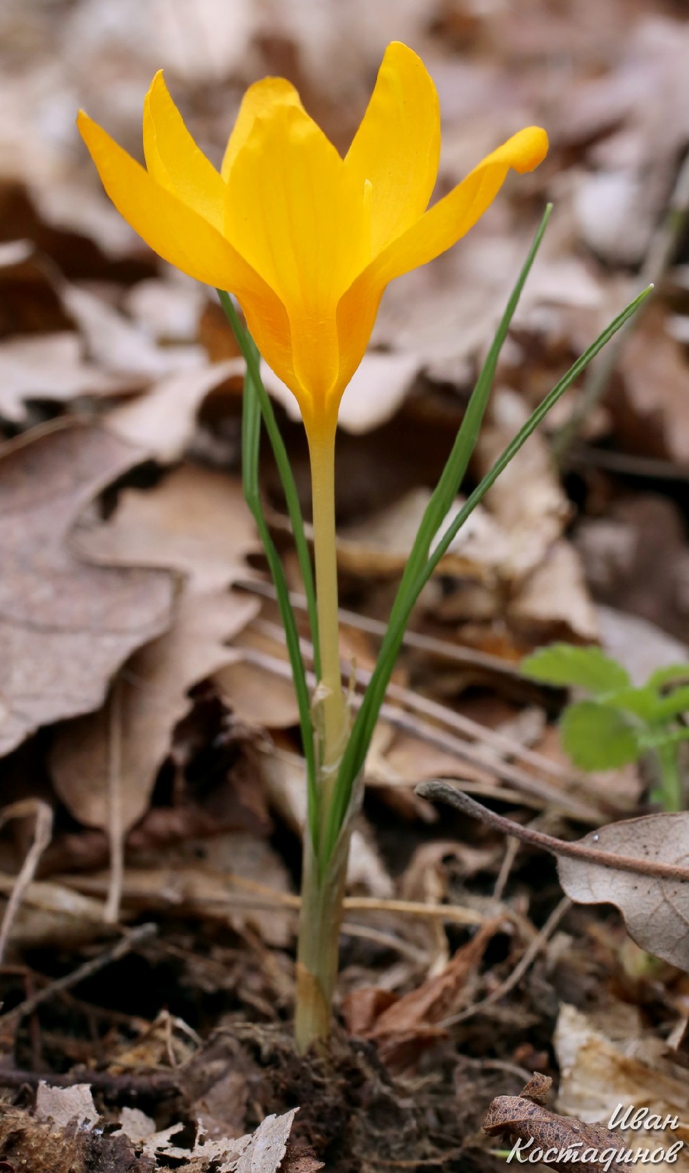 Crocus - Blüten gelb, äußere Kronblätter mit brauner oder violetter Zeichnung, Griffel mit 3 Ästen