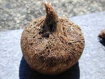 Knolle 8 - 15 mm im Durchmesser, Nacken 7 mm, Knollenhülle aus sehr feinen Fasern verwoben (dieses Merkmal hat nur Crocus fleischeri)