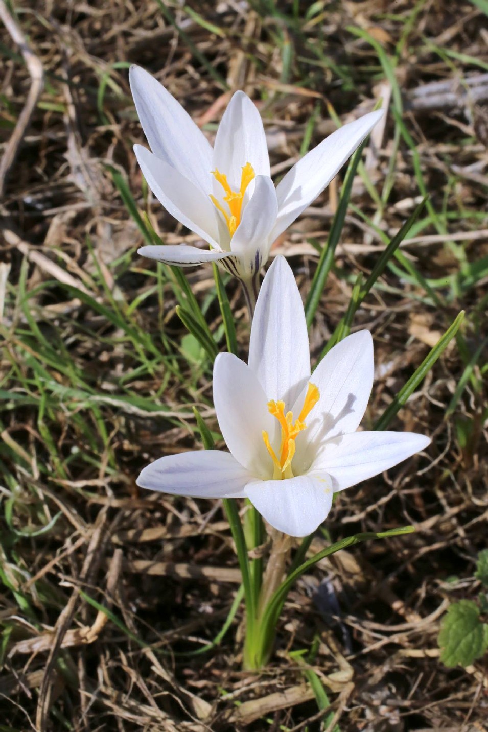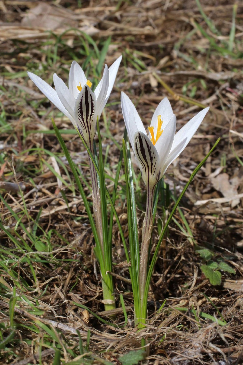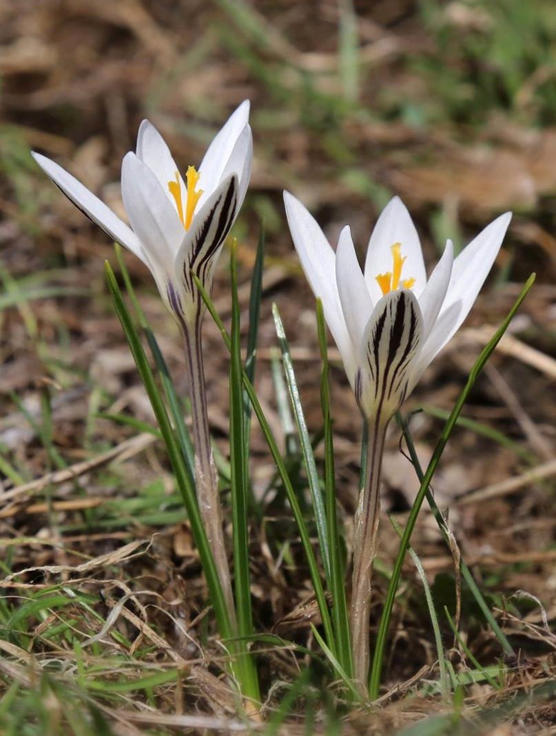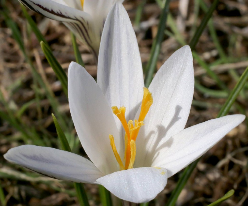Crocus - Frühjahrsblüher, Blüten überwiegend weiß, Griffel orange, Antheren gelb, Äußere Perigonblätter mit dunklen Streifen
