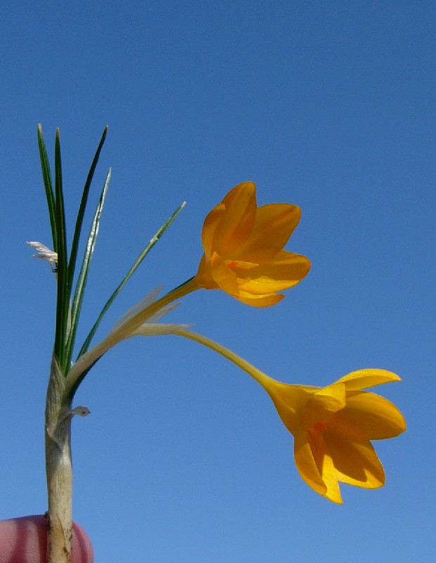 Blütenstandsstiel, Blätter oft mit weißem Mittelstreifen Perigonröhre lang, linealisch, Fruchtknoten zur Blütezeit unterirdisch Tragblätter membranös, die Perigonröhre einhüllend > Crocus (Krokus)