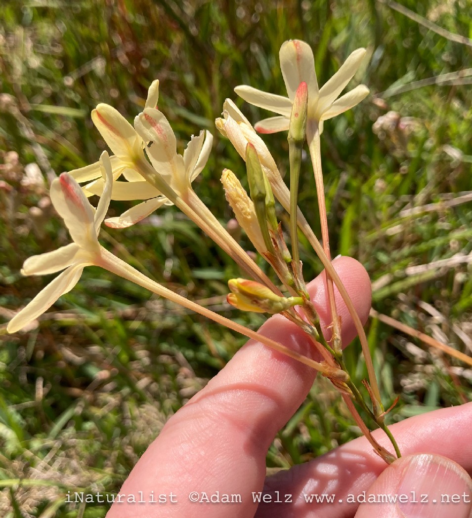 Blütenstände rispig, mit 3 - 15 sitzenden Blüten, äußere Perigonzipfel außen rot überlaufen, Hüllblätter dachziegelig überlappend, klein, membranös, den Fruchtknoten und den unteren Teil des Hypanthium umhüllend, Hypanthium gerade, schlank
