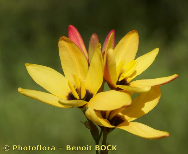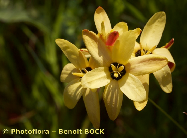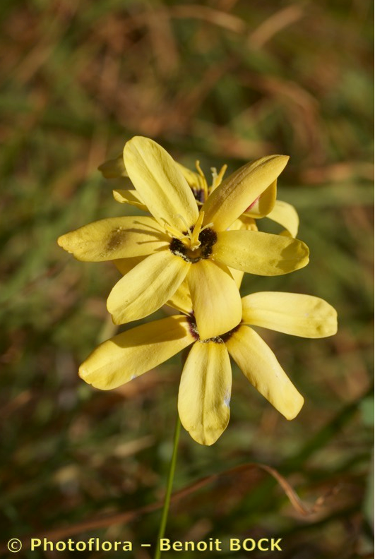 Blüten radiär, innen gelb, ohne schwarzvioletten Kreis um den Eingang zum Hypanthium, Perigonzipfel +/- gleich groß, 15 25 mm lang, 3 - 8 mm breit, mit 3 Staubblättern, Antheren gelblich, Griffel mit 3 fädlichen Ästen