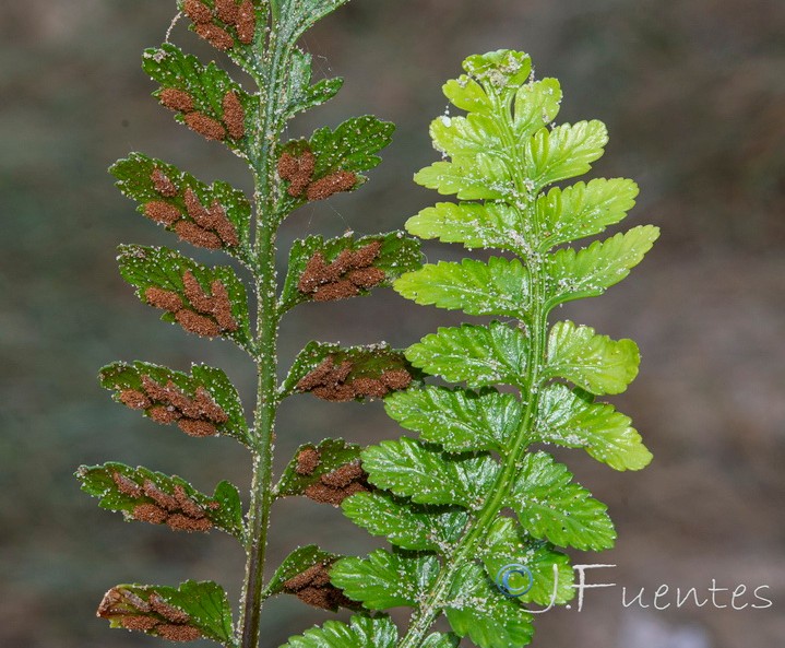 Fiederblättchen im Herbst abfallend, Gesamte Blattspindel bis zur Spitze braun, schmal geflügelt Sori länglich, mit Schleier