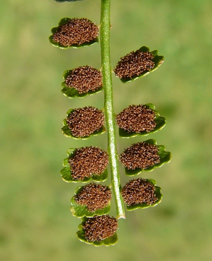 Blätter mit ca. 30 Fiederblättchen Blattstiel kürzer als die Spreite Blattspindel grün, ungeflügelt Fiederblättchen mit kurzen, schlanken Stielchen Sori linealisch, mittig, den Rand nicht erreichend Sori im Alter verschmelzend, oft die gesamte Blättchenunterseite bedeckend