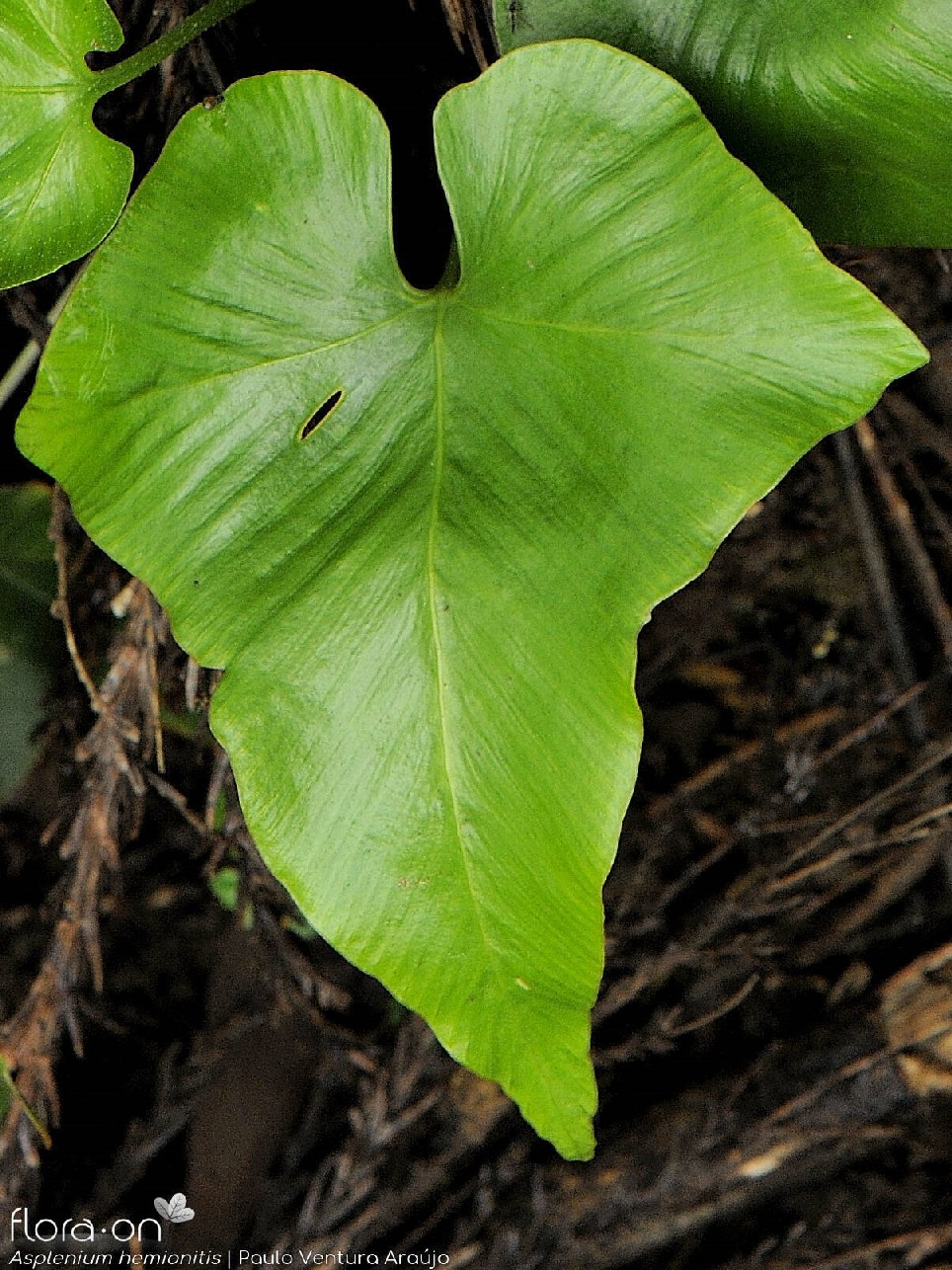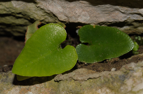 Blattspreite lederartig, bis 18 cm lang, 16 cm breit, glänzend, mit tief herzförmigem Grund,