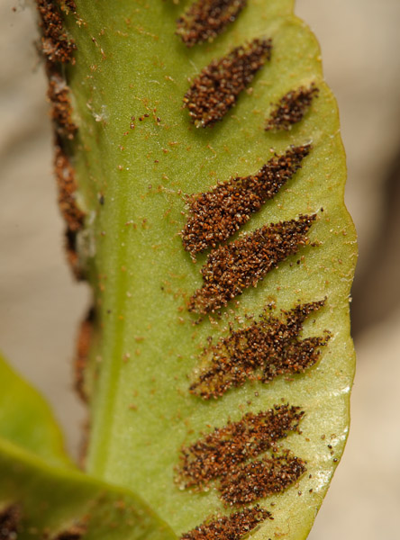 Sori auf der Blattunterseite in elliptischen, ca. 13 mm langen Streifen angeordnet