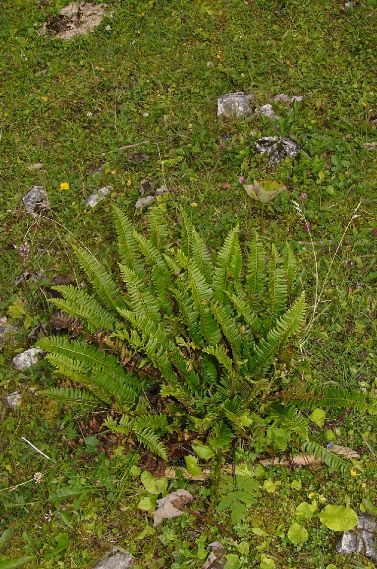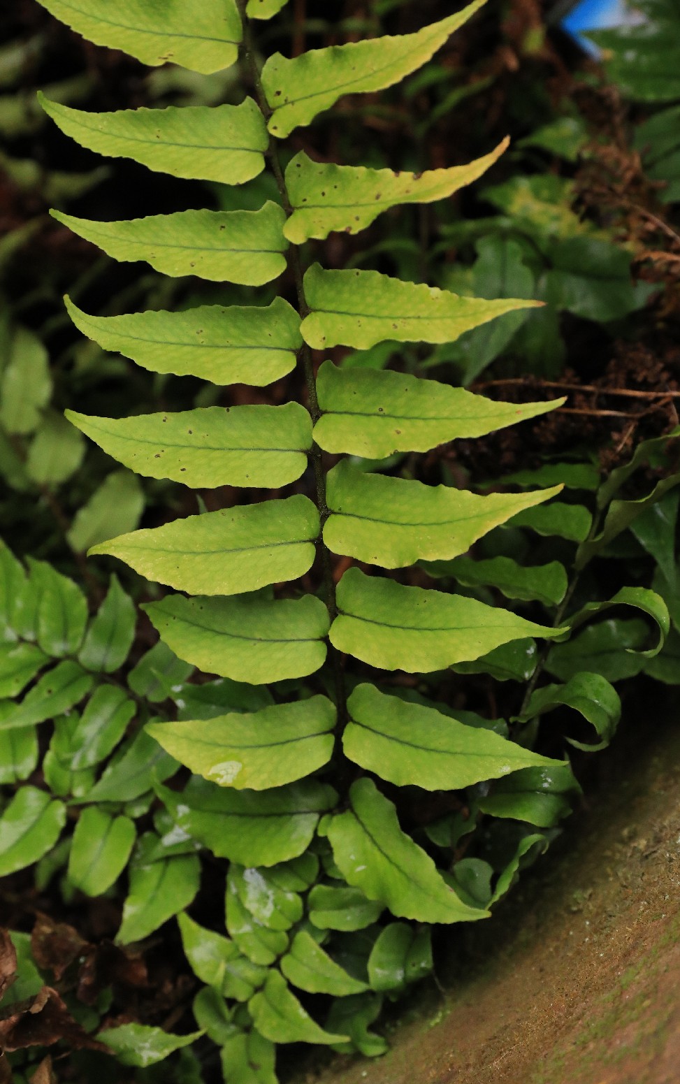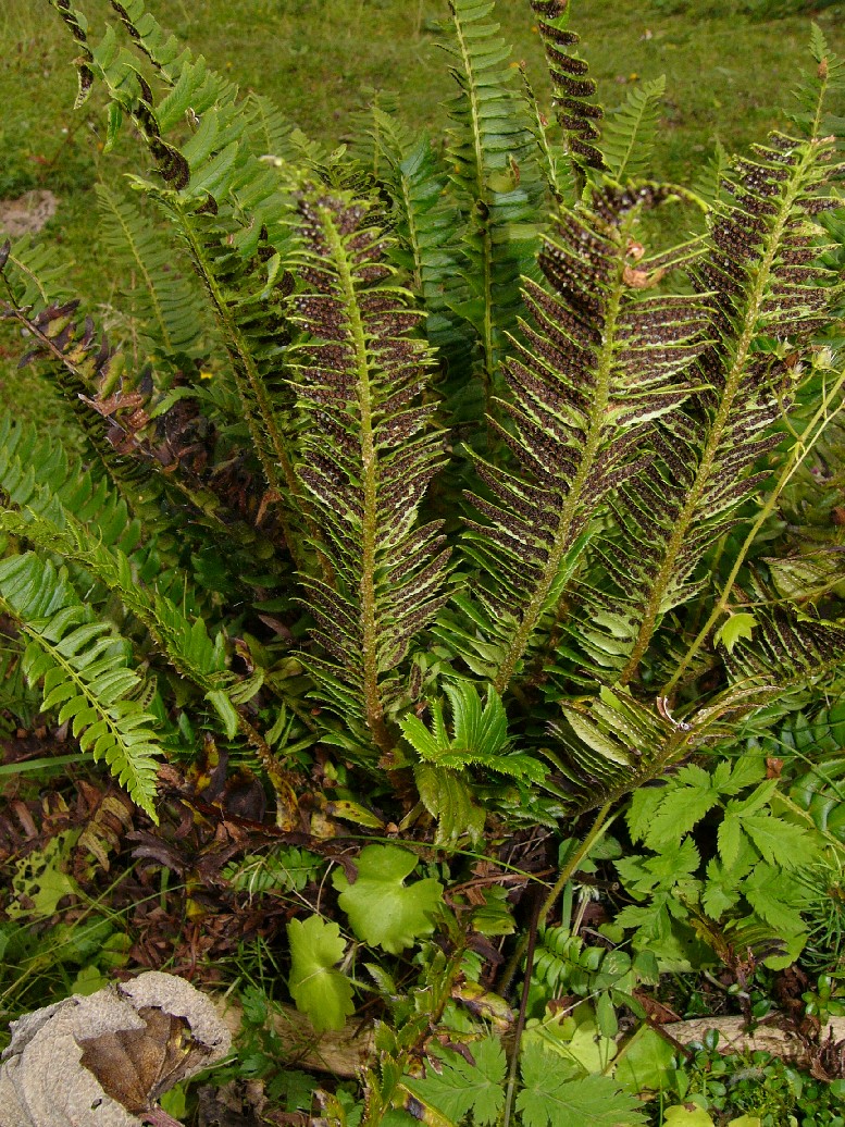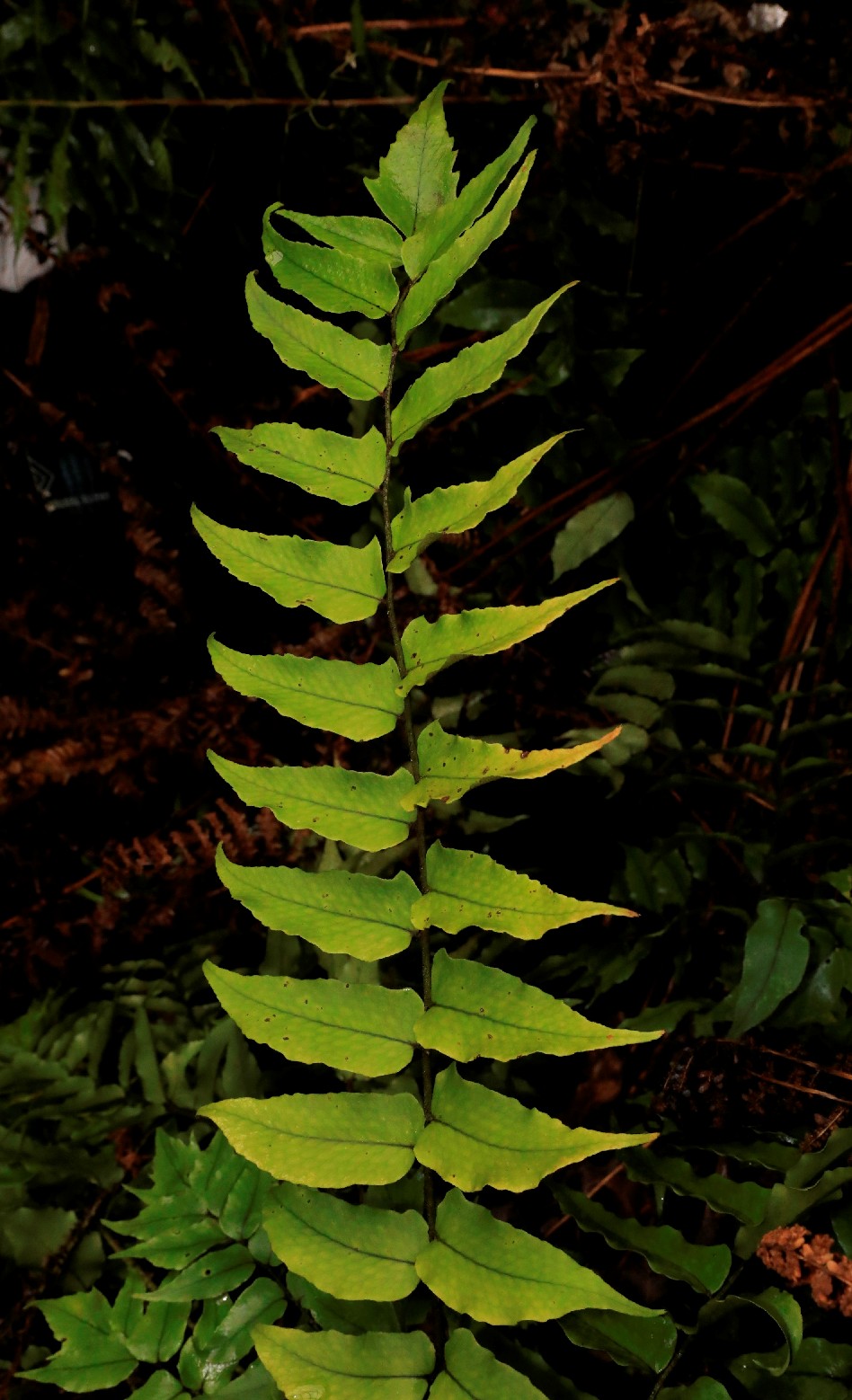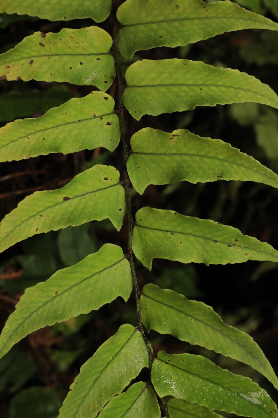 Pflanze 10 - 50 cm groß, immergrün Wedel kurz gestielt, aufrecht Spreite lanzettlich, mit bis zu 50 Blattpaaren Blätter einfach gefiedert Fiedern 15 - 20 mm lang, 8 mm breit Fiedern am Grund deutlich unsymmetrisch, dornig gezähnt, derb ledrig Sori nur in der oberen Blatthälfte Sori rundlich