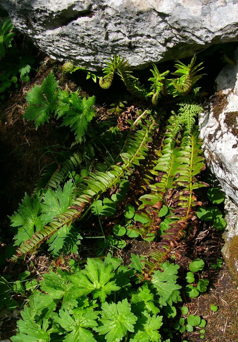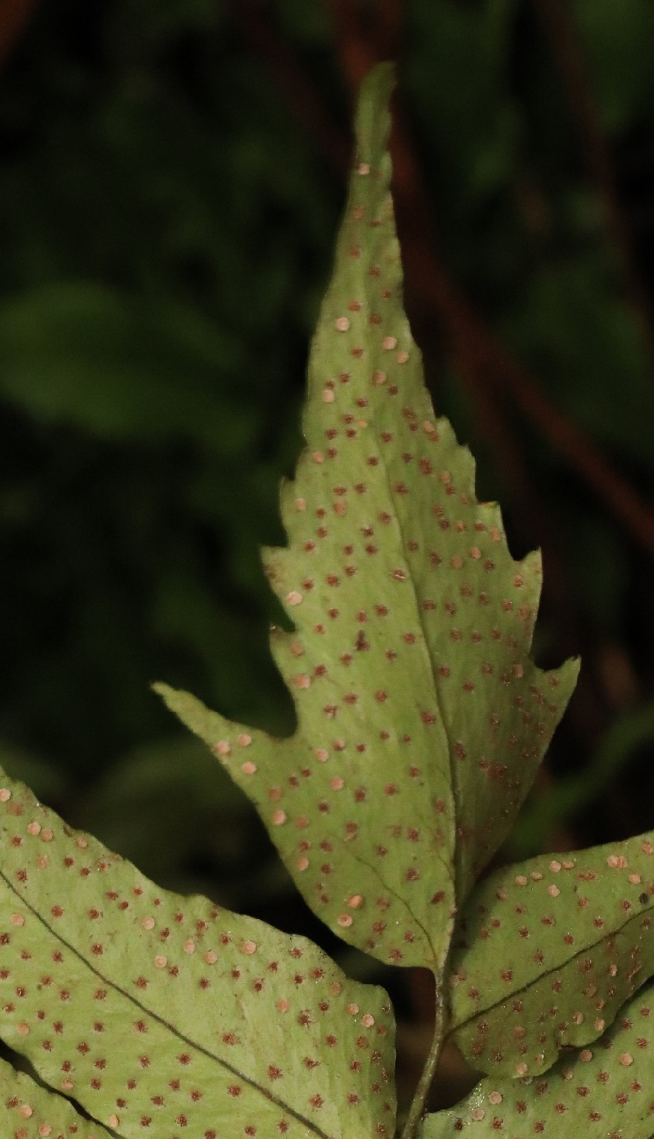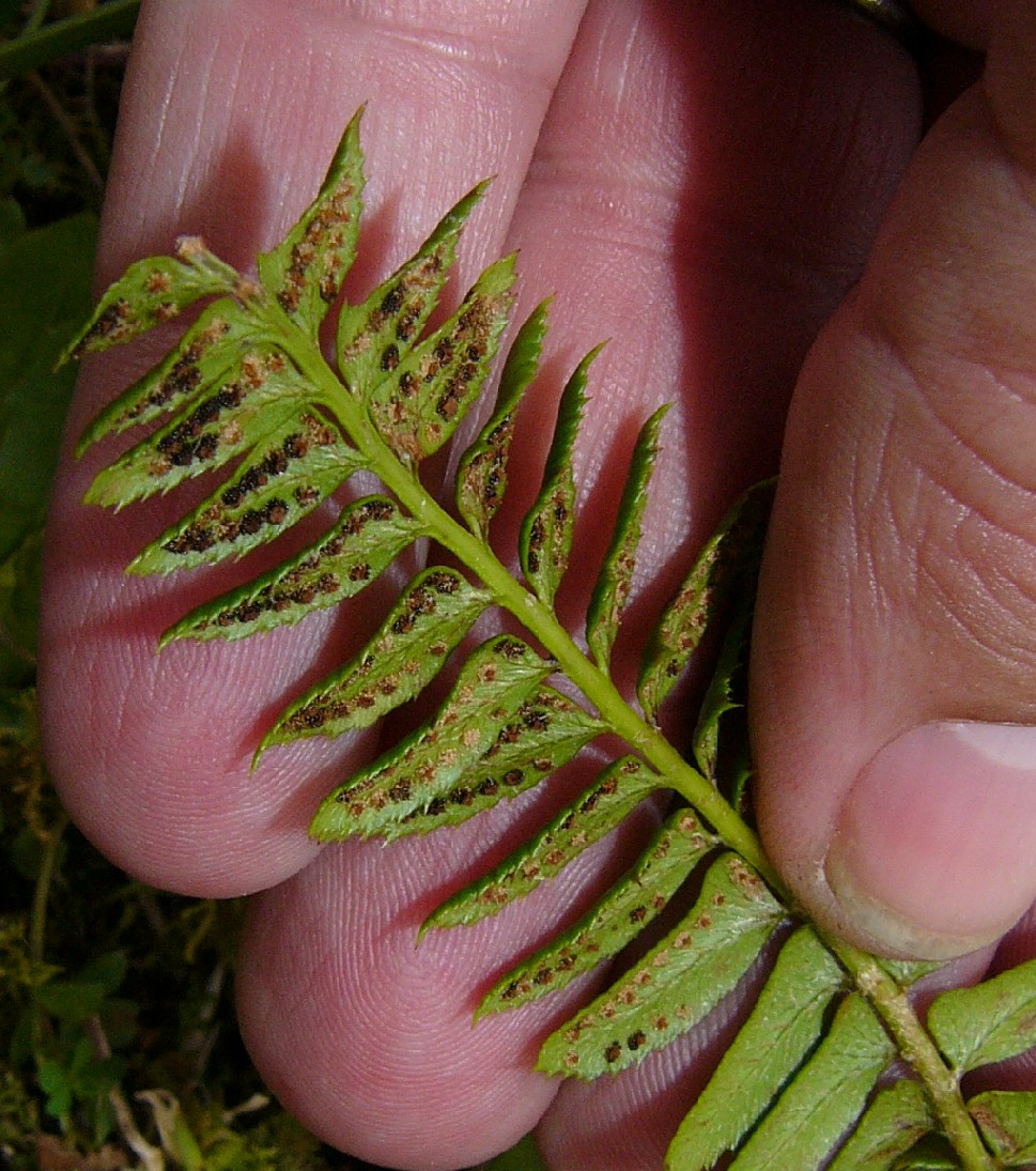 2 Fiedern 15 - 20 mm lang, 8 mm breit, am Rand dornig gezähnt, unterseits meist mit 2 Reihen Sori