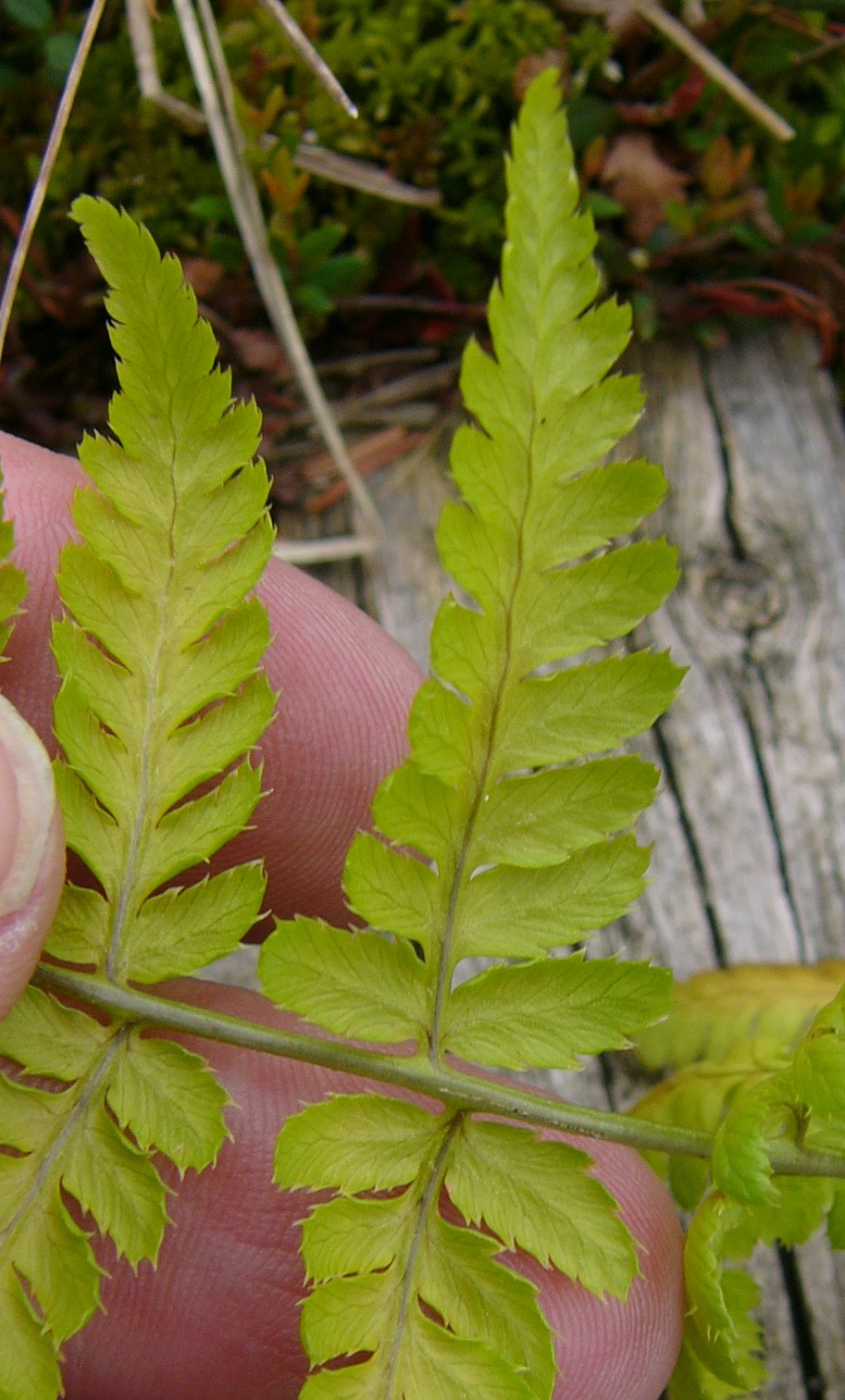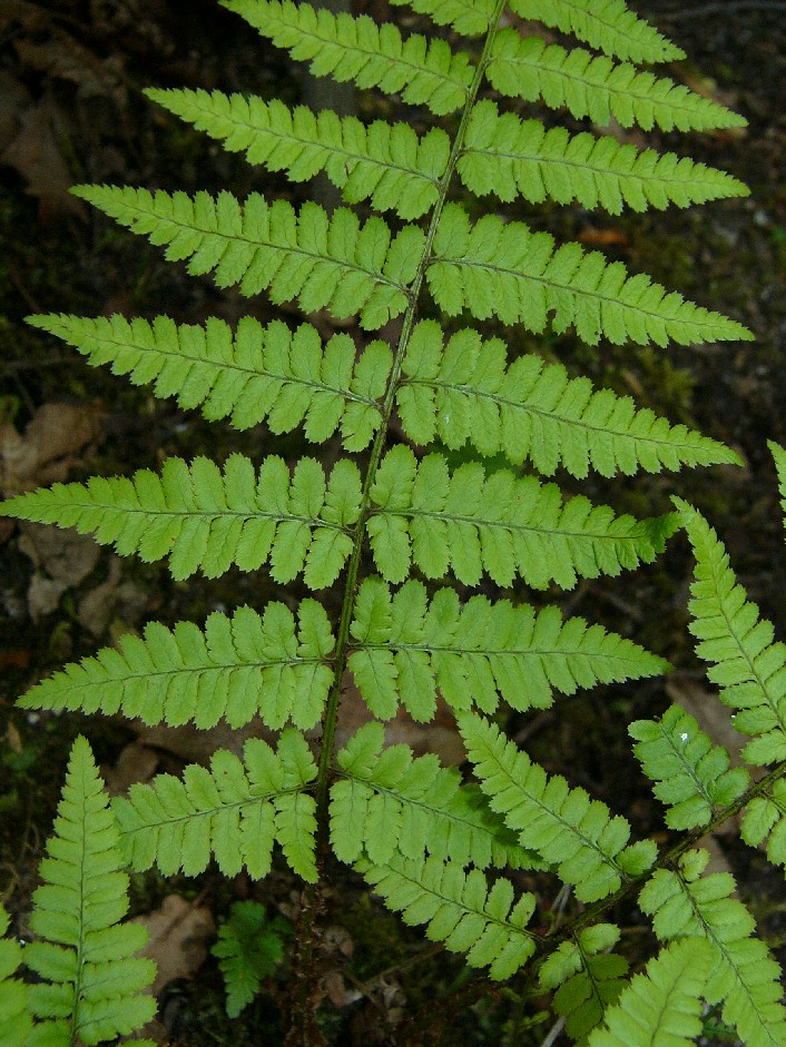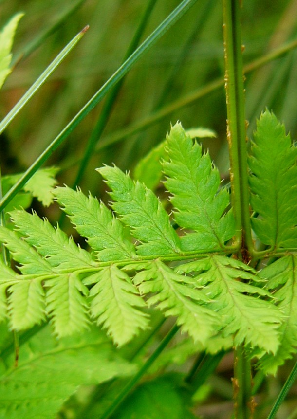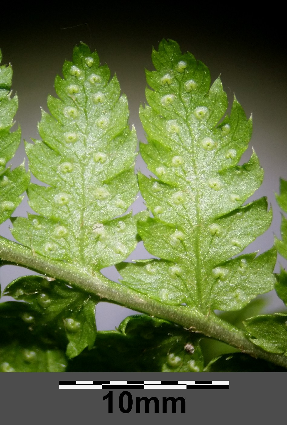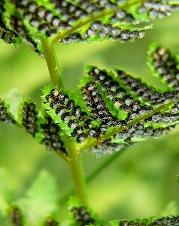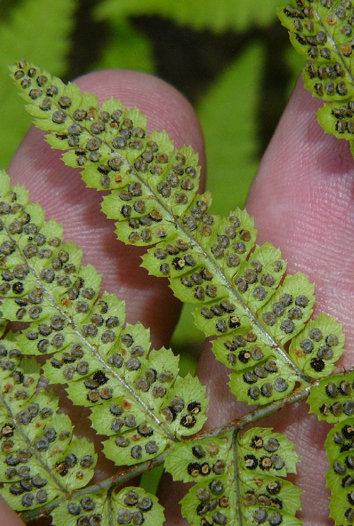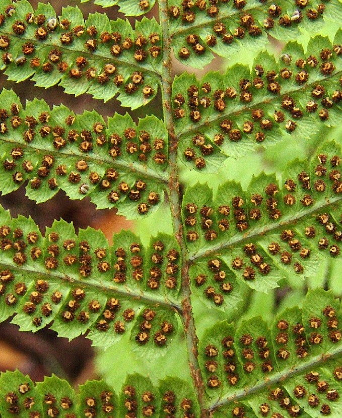Fiederspindel am Grund nicht violettschwarz Endfiederchen gezähnt oder fiederteilig, kaum gebuckelt, mit langen Stachelspitzen Unterseite mit 1 - 4 Sori pro Blättchen,