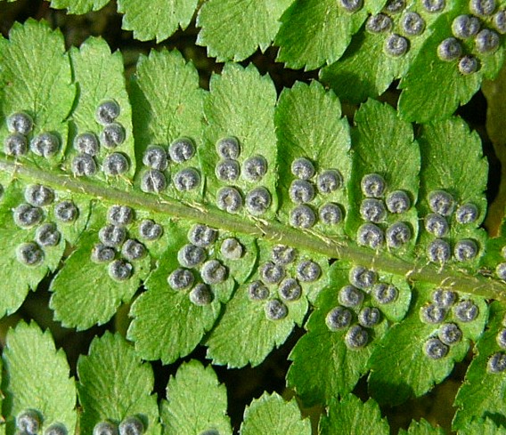 Farne - An Land lebend, Blätter mehr als 45 cm groß, nicht durchscheinend, mehrfach gefiedert, fertile grüne Blätter mit Sori, Sori nicht randständig, rundlich