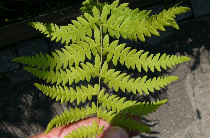 Wedel einzeln, nicht rosettig, 1- 2- fach gefiedert, unterstes Fiederpaar nicht abgewinkelt Fiederblättchen hellgrün, ganzrandig, dünn, +/- spitz Fiederpaare an der Blattspindel nicht verbunden, oberseits mit einzelnen Haaren Blattunterseite spärlich mit nadelartigen Haaren