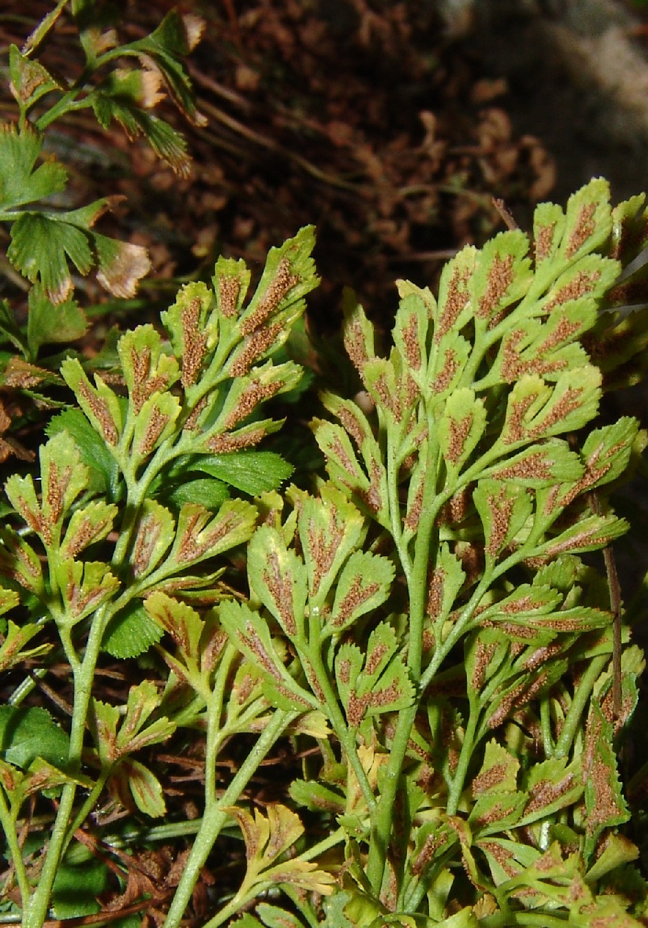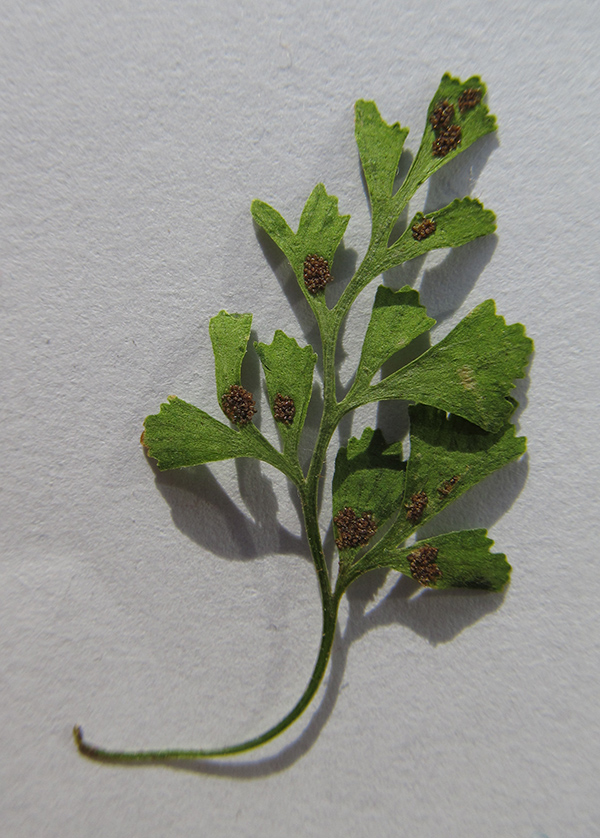 Sori später haufenförmig, fast das gesamte Fiederchen bedeckend Blattstiele grün, nur am Grund braun,