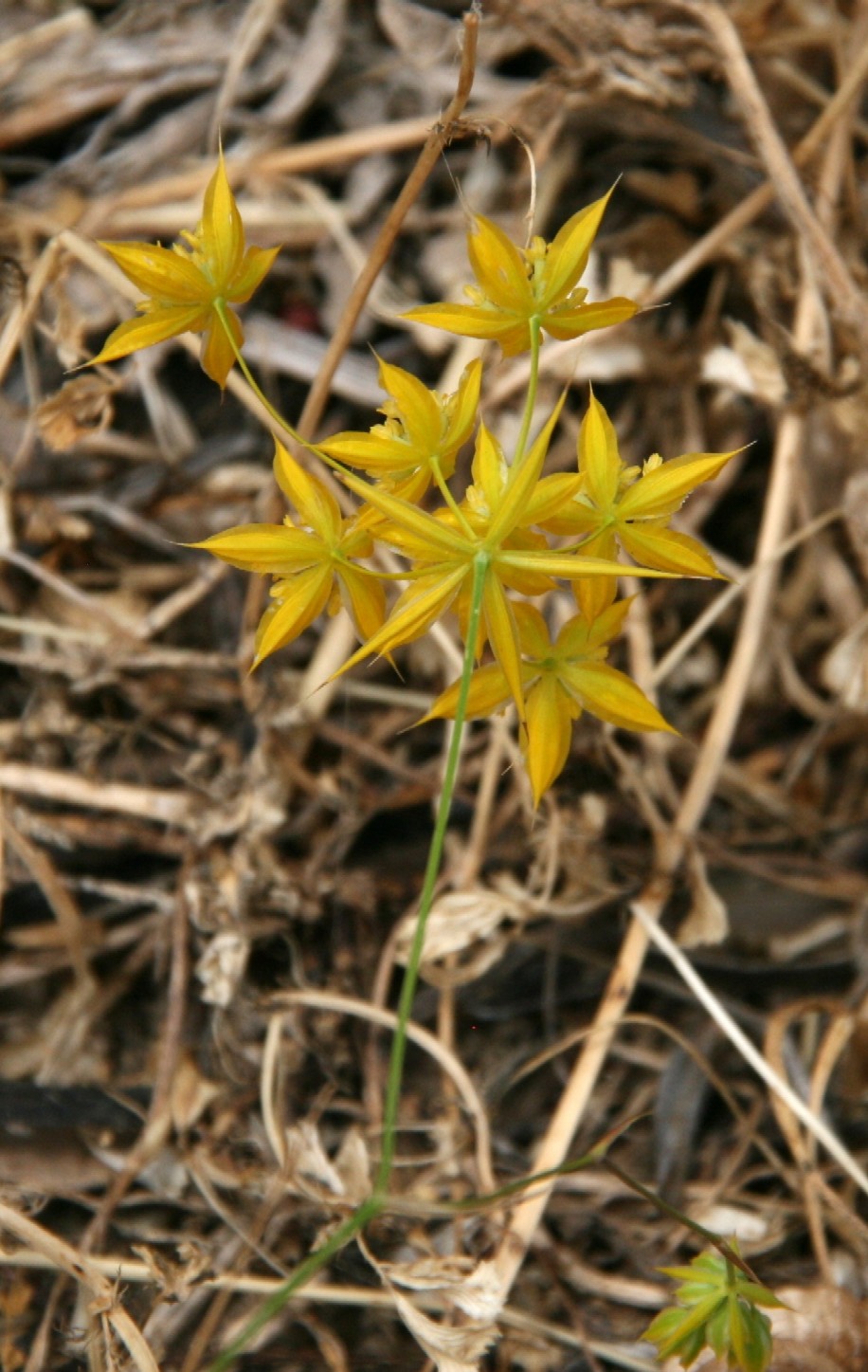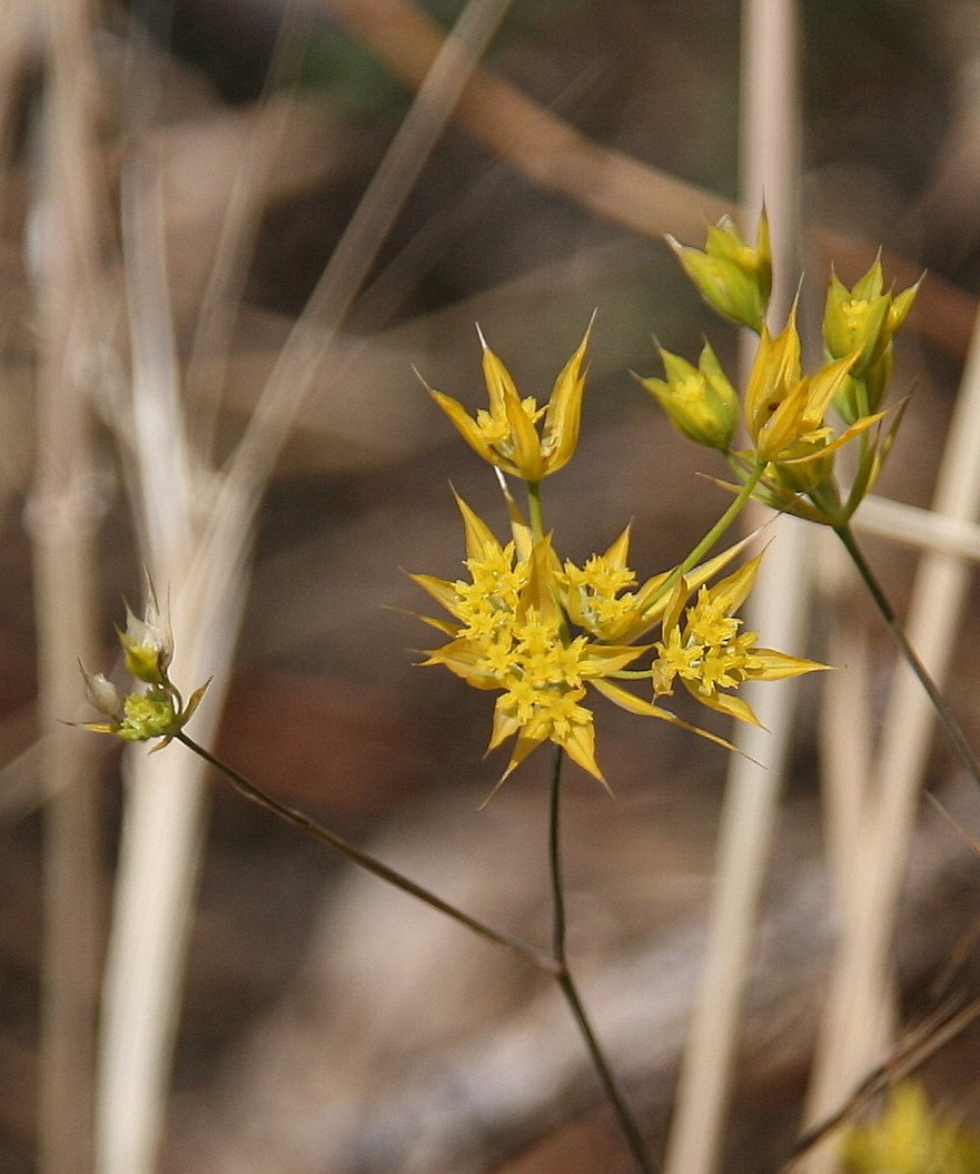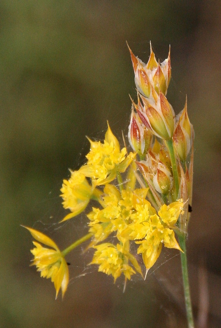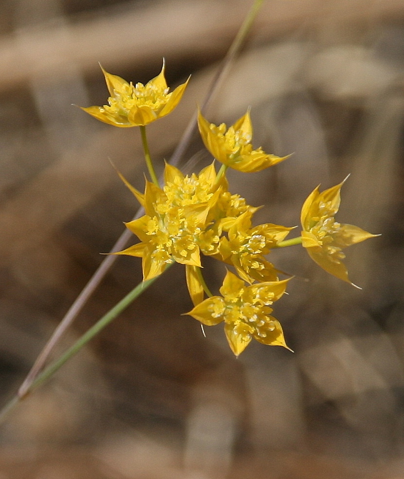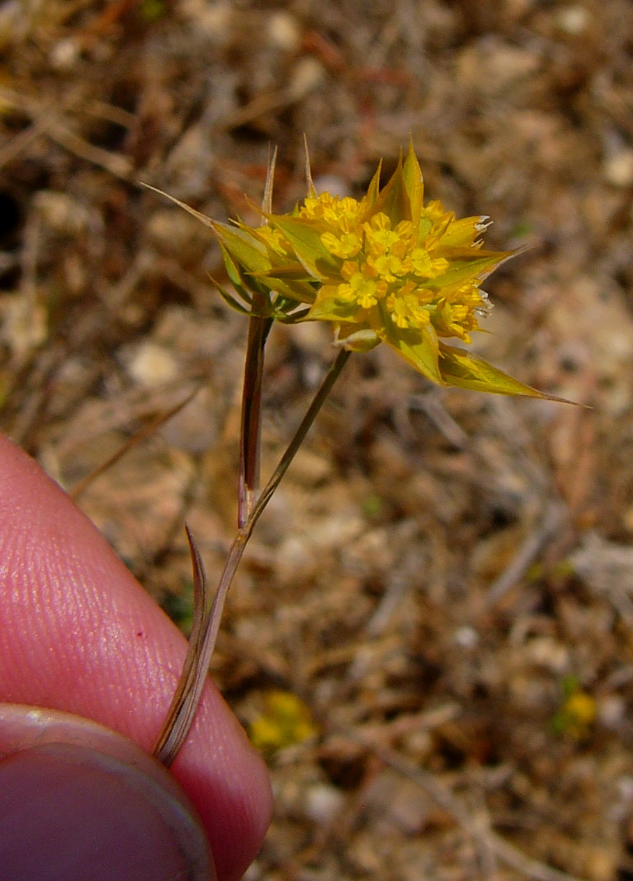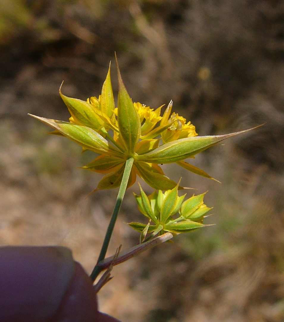 Blütenstand sparrig verzweigt mit mehreren Dolden, die jedoch nur 1 Doldenstrahl besitzen Hüllblätter schmal lanzettlich, länger als der Doldenstrahl, strohgelb, trockenhäutig, ganzrandig, mit breiten Adern