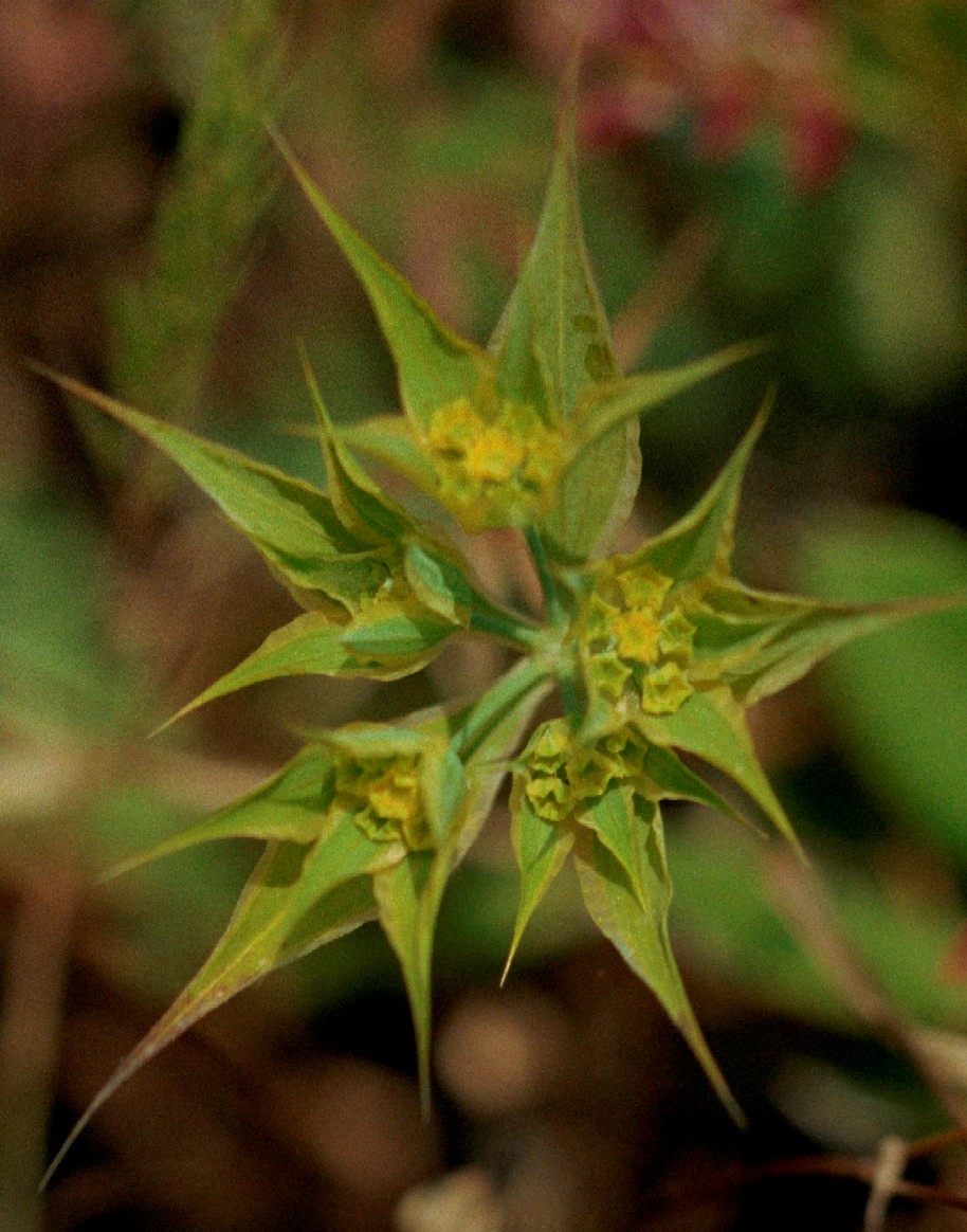 Hüllchenblätter 5, stumpflich, mit 1 - 2 mm langer Stachelspitze, mit 3 parallelen Hauptnerven und 2 deutlichen seitlichen Adern, am Rand schmal (ca. 0,2 mm) häutig