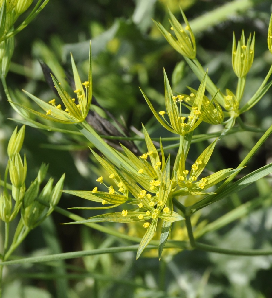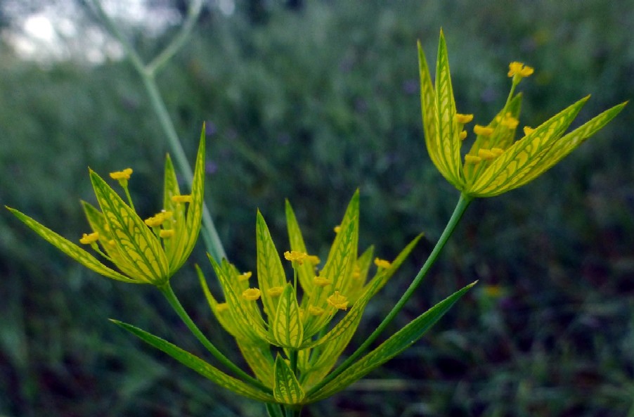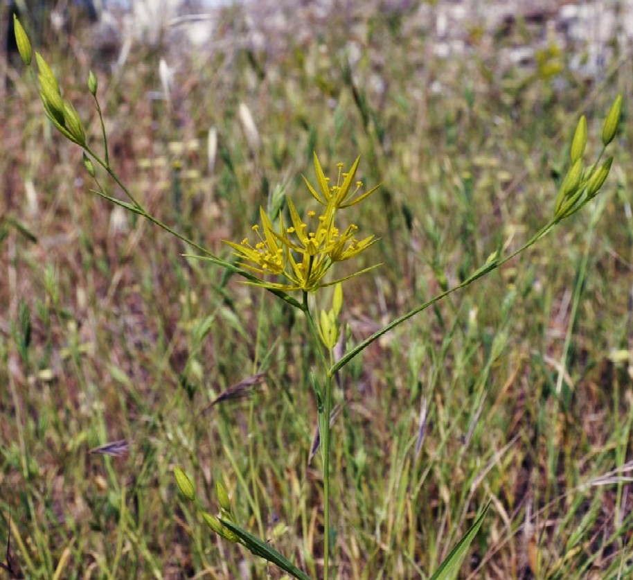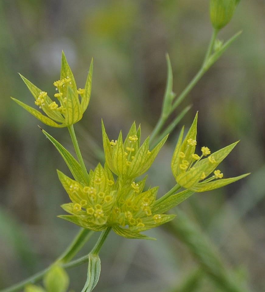 Dolden end- und seitenständig, 5 - 7-strahlig, mit 5 - 7 aufrechten oder abstehenden eilanzettlichen, spitzen Hüllblättern,