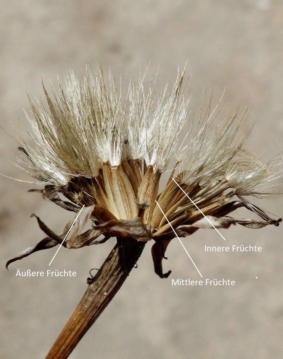 Äußere Früchte mit Pappus aus Haaren, innere mit hellen Schuppen