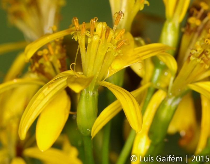 Korbstand vielköpfig, Köpfchen 15 - 26 mm im Durchmesser, mit 4 - 5 gelben Zungenblüten und 7 - 14 Röhrenblüten, Zungenblüten 17 - 20 mm lang, 2 - 3,5 mm breit