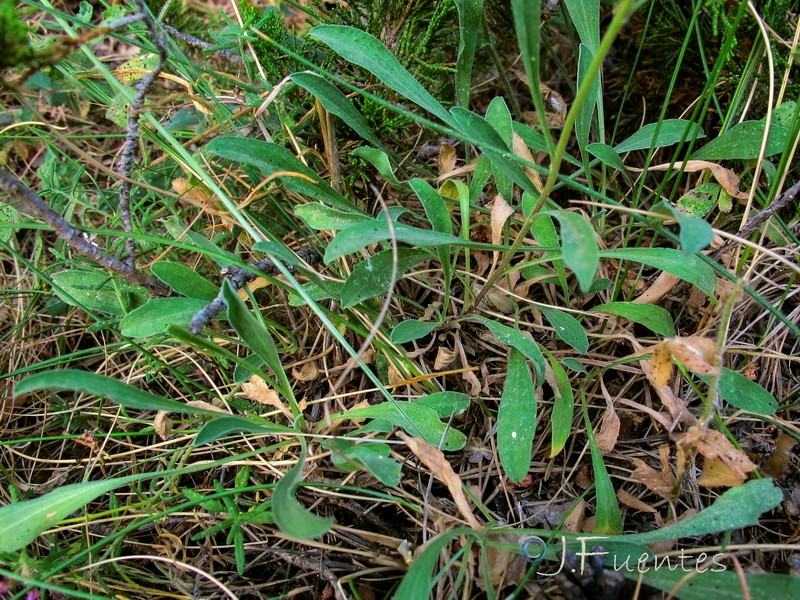 Untere Blätter eilanzettlich oder spatelig, 20 - 35 mm lang, 4 - 8 mm breit, ei lanzettlich, 3- aderig, ganzrandig, am Rand nicht umgebogen, gestielt, unterseits durch Drüsen punktiert,rau kurzhaarig