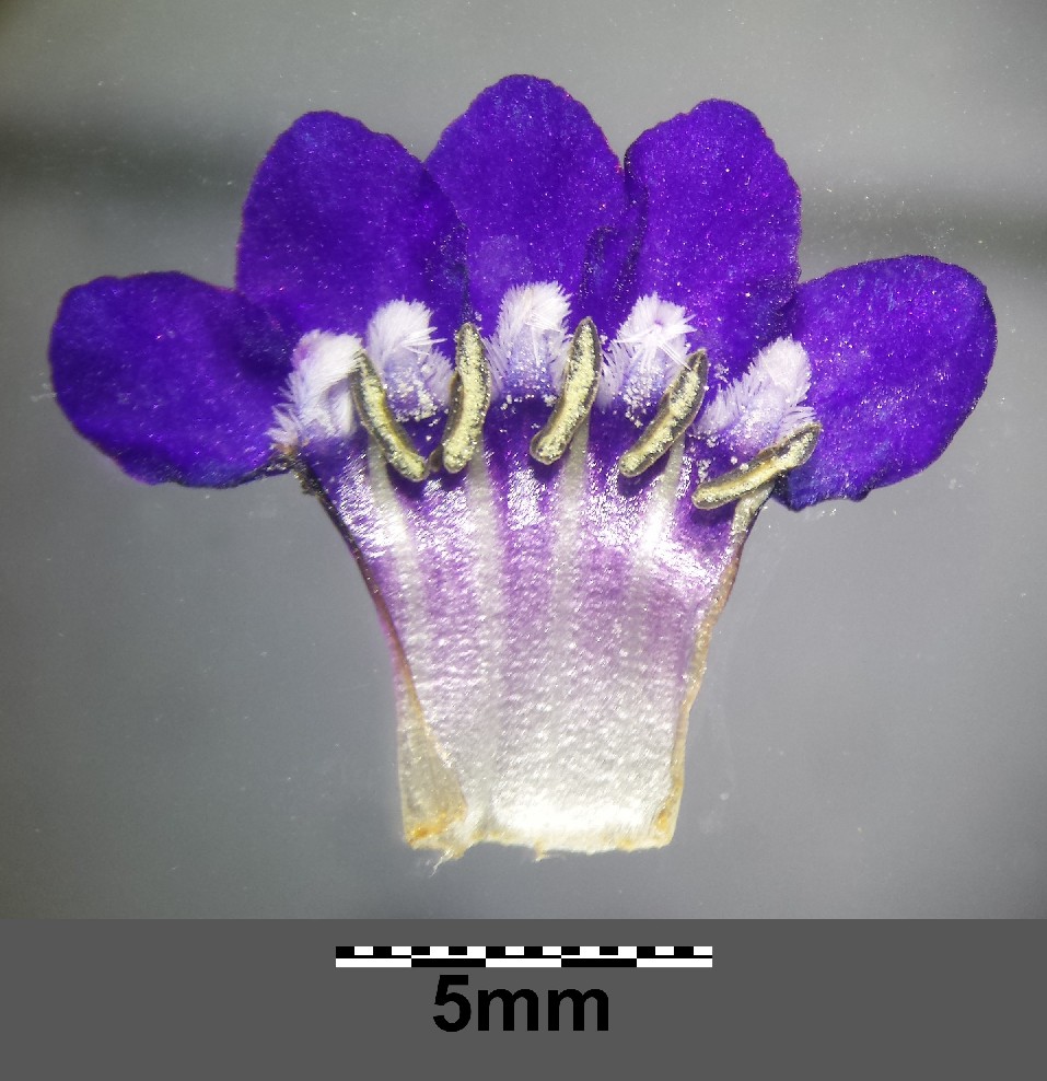 Krone blauviolett, 5 - 6 mm im Durchmesser, in der Mitte mit 5 papillösen, weißen Schlundschuppen, mit stumpfen Kronlappen, Kronröhre gerade, 4 - 5 mm lang, Staubblätter in der oberen Hälfte der Kronröhre ansetzend