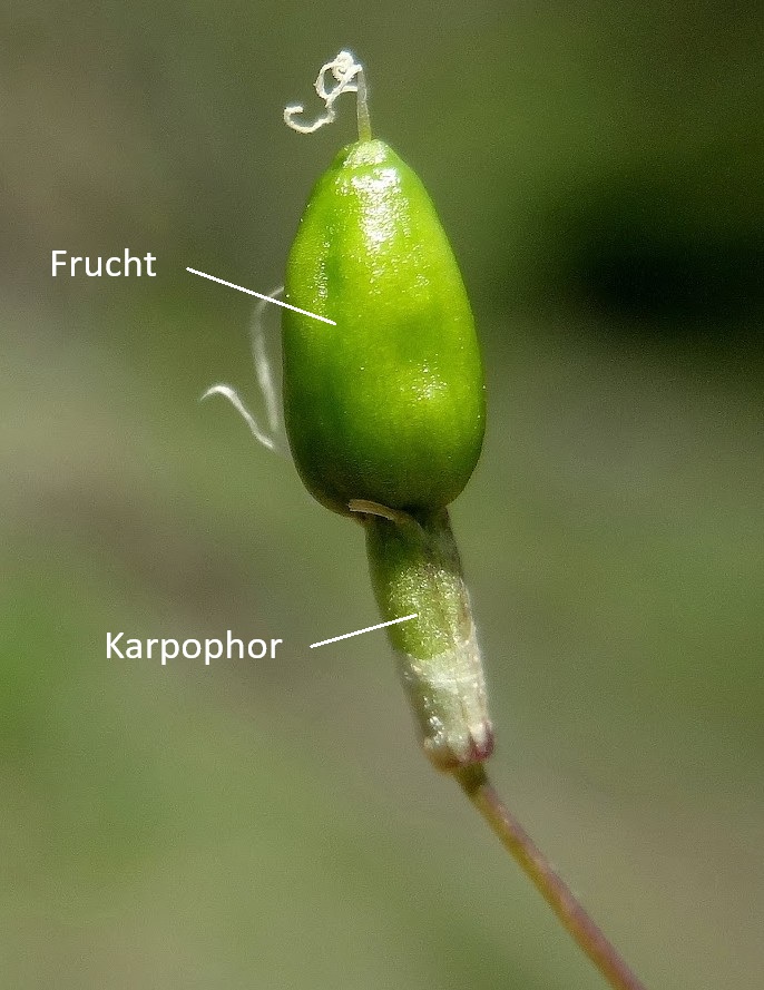 Anthophor = Androgynophor = Gonophor: säulenartigen Stiel, der den Fruchtknoten vom Blütenboden abhebt, das Anthophor/Gonophor ist vom Kelch umgeben und in der Regel dünner als der vom Kelch umgebene Fruchtknoten (um Kapsel und Gonophor sehen zu können, müsste man den Kelch entfernen. Man kann jedoch auch ohne den Kelch zu entfernen in etwa das die Lage von Kapsel und Gonophor abschätzen)