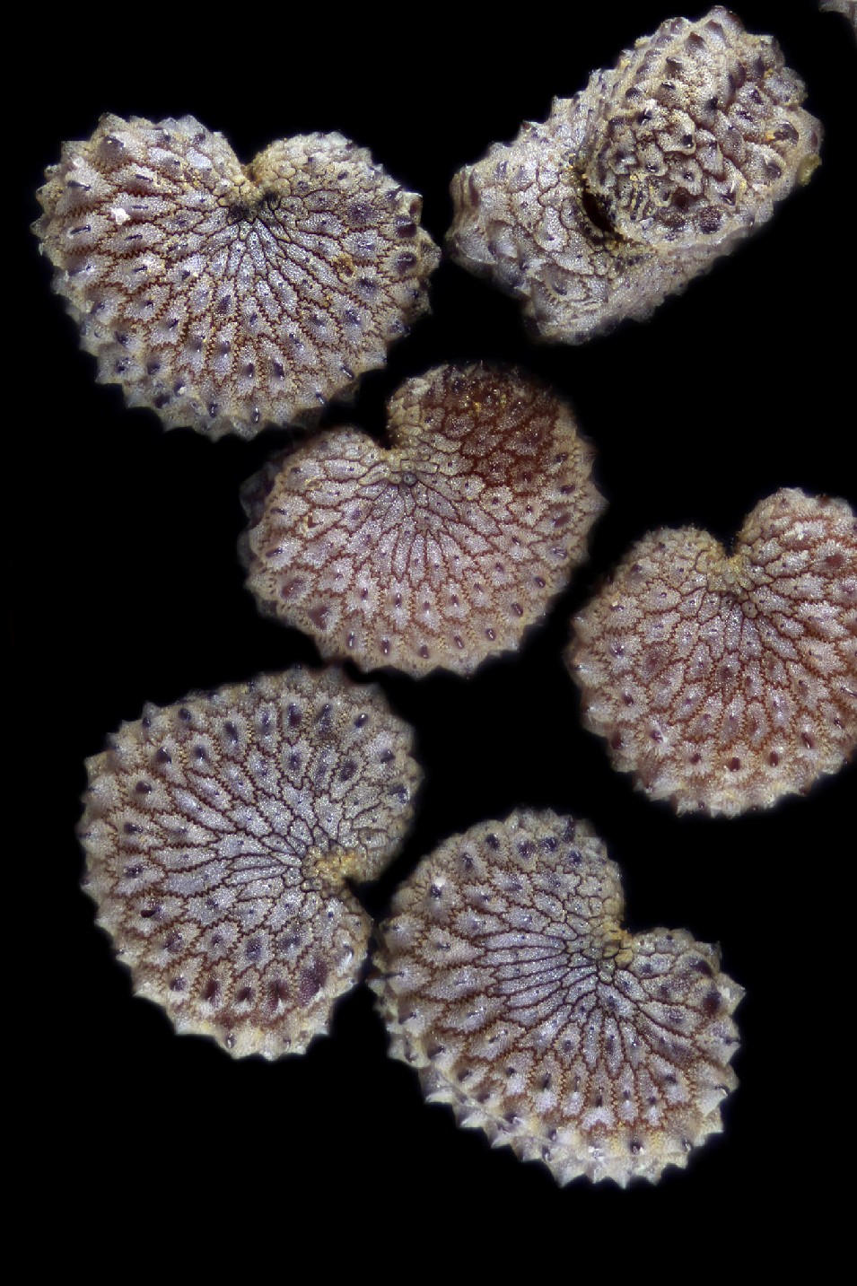Zellen der Samenschale sind meist gezähnelt und können in der Mitte kegelförmige, edelsteinähnliche Warzen besitzen