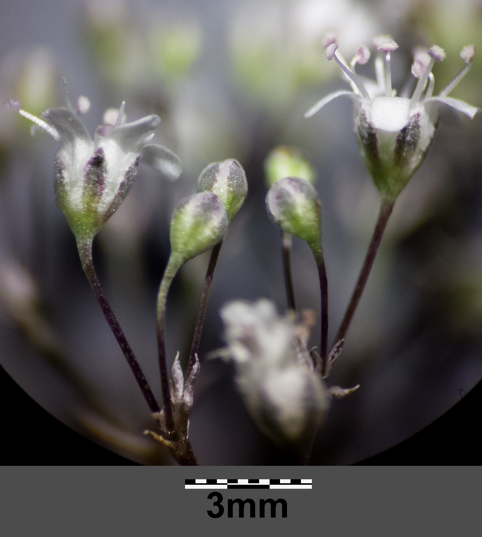 Blüten ca. 4 mm im Durchmesser, 5 Kronblättern, 5 Kelchblätter, 10 Staubblätter 2 Griffel,