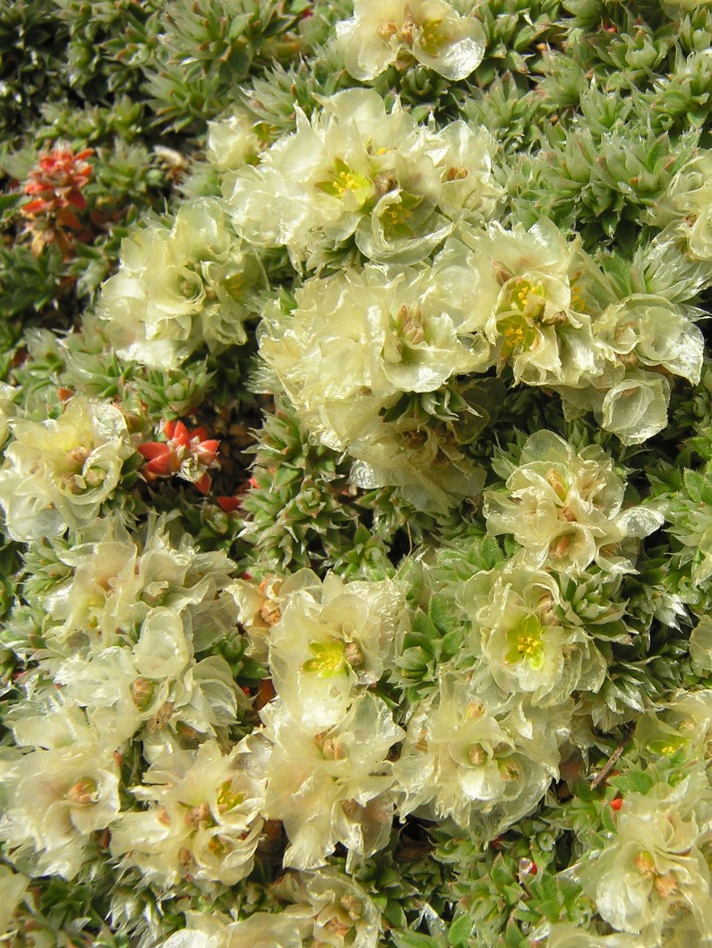 Blüten von zahlreichen silbrigen, häutigen Hochblättern umgeben
