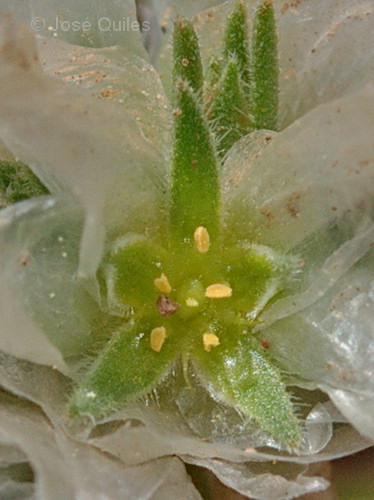 Blüten aus 5 hellgrünen, kurz begrannten, am Rand schmal trockenhäutigen verschieden großen Kelchblättern,  Kronblätter fehlend, Hüllblätter wenig länger als die Kelchblätter, diese kaum verdeckend