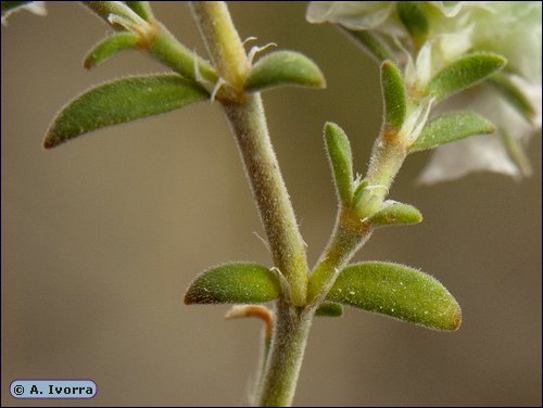 Blätter 3 - 7 mm lang, graugrün, schmal elliptisch, +/- fleischig, auf beiden Seiten weich angedrückt behaart, mit 4 häutigen, silbrig- glänzenden Nebenblättern, die nur wenig kleiner al die Blätter sind