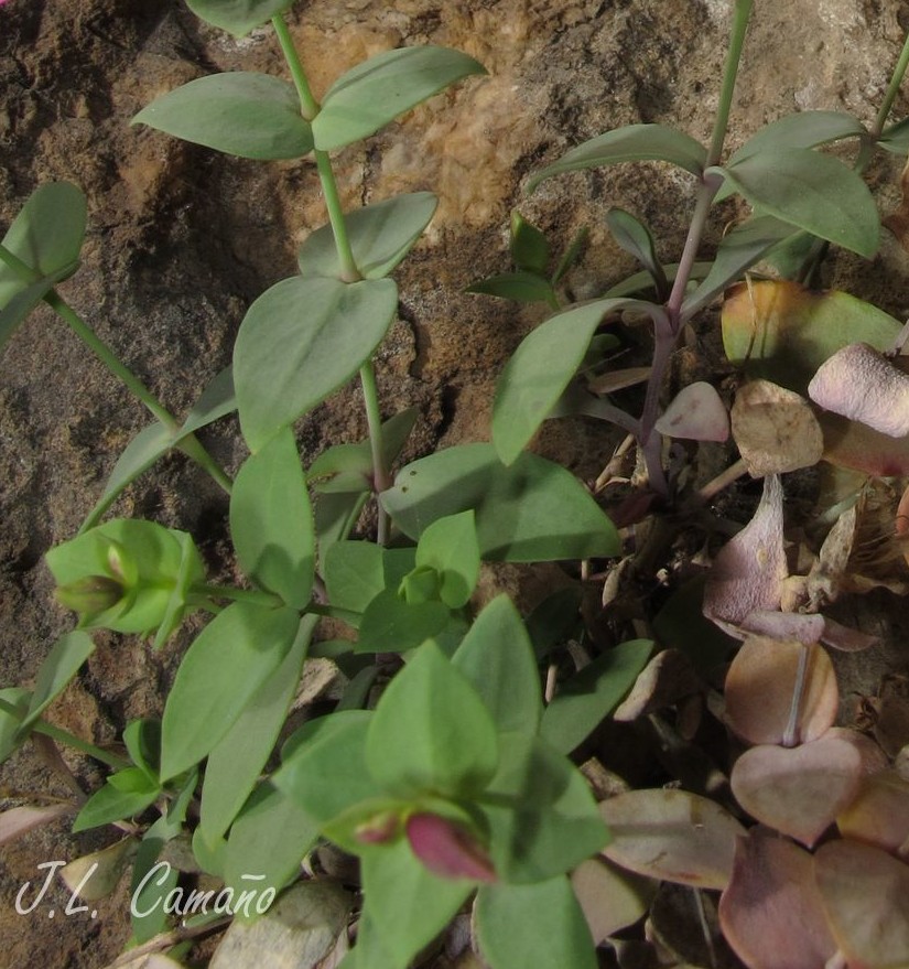 Stängel ohne Drüsen, nicht klebrig, Blätter gegenständig, obere sitzend, die unteren kurz gestielt, elliptisch, spitz blaugrün, kahl