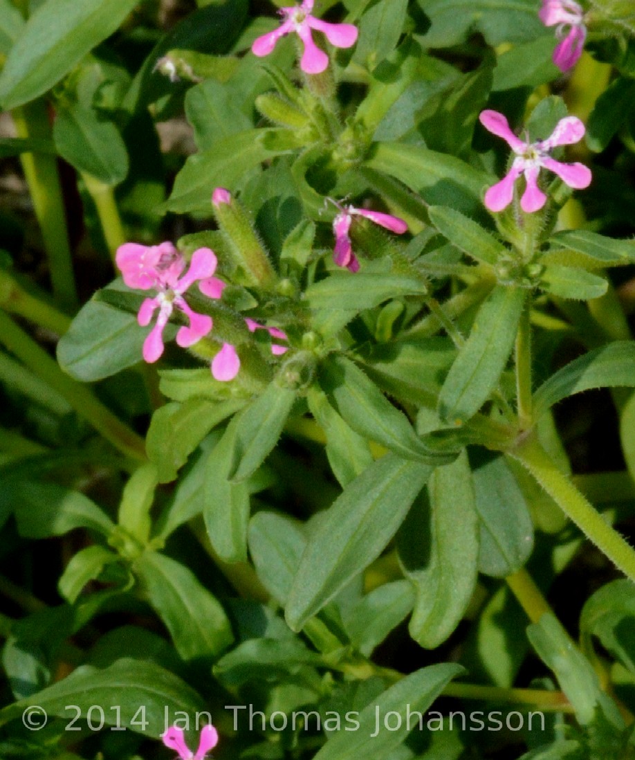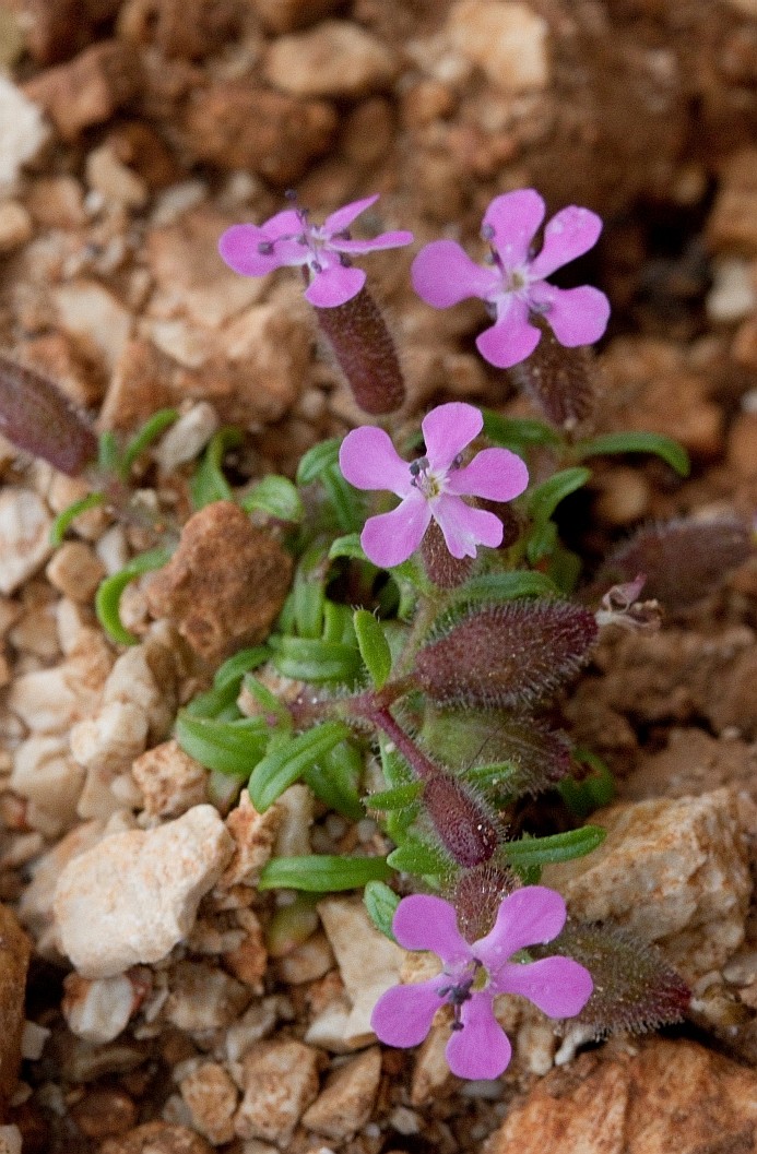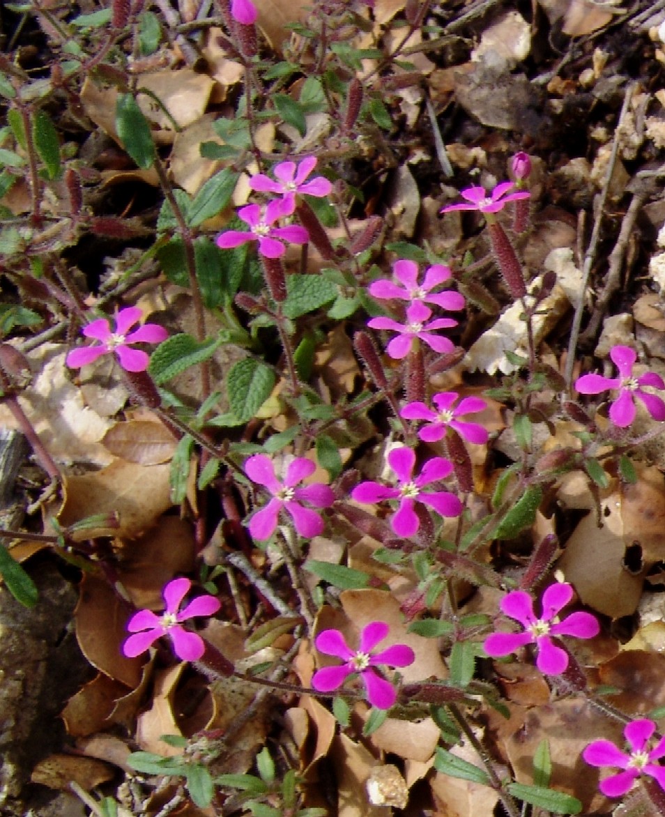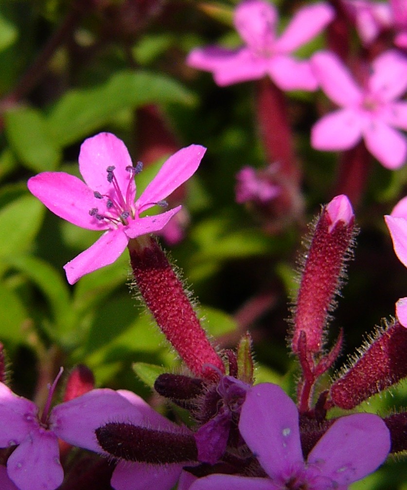 Kronblattzipfel trommelschlägelförmig, da sich die Platte abrupt in den schmalen Nagel verschmälert, 2 Griffel, 10 Staubblätter, Kelch zu einer Röhre verwachsen, 10 - 12 mm lang, drüsig behaart, Kelchzähne kurz