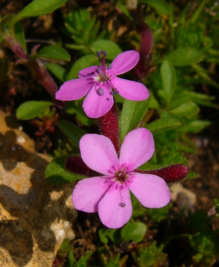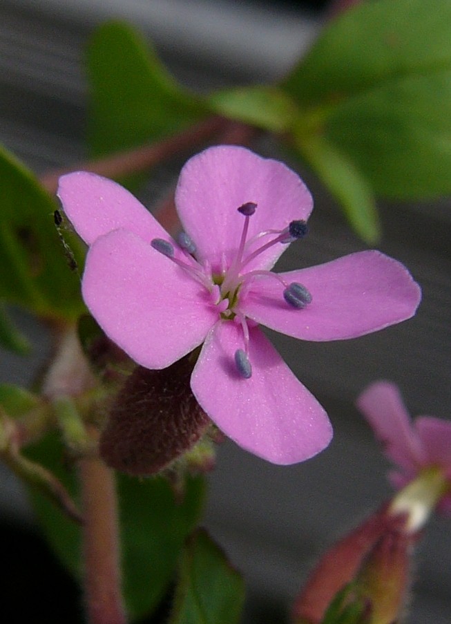 Blüten hellrosa, mit Nebenkrone, Kronblattzipfel trommelschlägelförmig, da sich die Platte abrupt in den schmalen Nagel verschmälert, 2 Griffel, 10 Staubblätter, Kelch zu einer Röhre verwachsen, 6 - 7 mm lang, drüsig behaart, Kelchzähne kurz