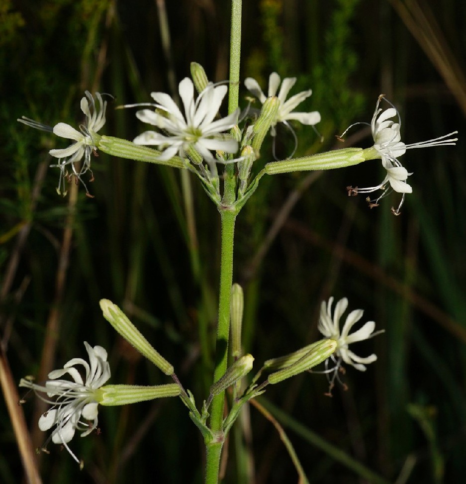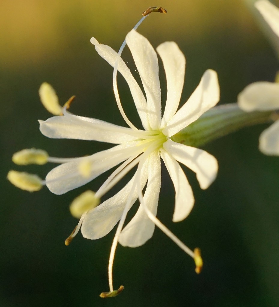 Blüten zwittrig, 5 Kronblätter 10 Staubblätter, 3 Griffel, Nebekrone fehlend oder zu winzigen Höckern reduziert, Platte der Kronblätter fast bis zum Grund eingeschnitten ober- und unterseits rein weiß, Staubblätter und Griffel weit aus der Krone ragend