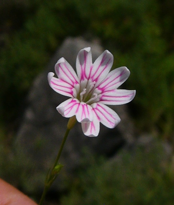 Kronblätter 7 - 9 mm lang, hellrosa oder weiß, mit dunklen Adern,